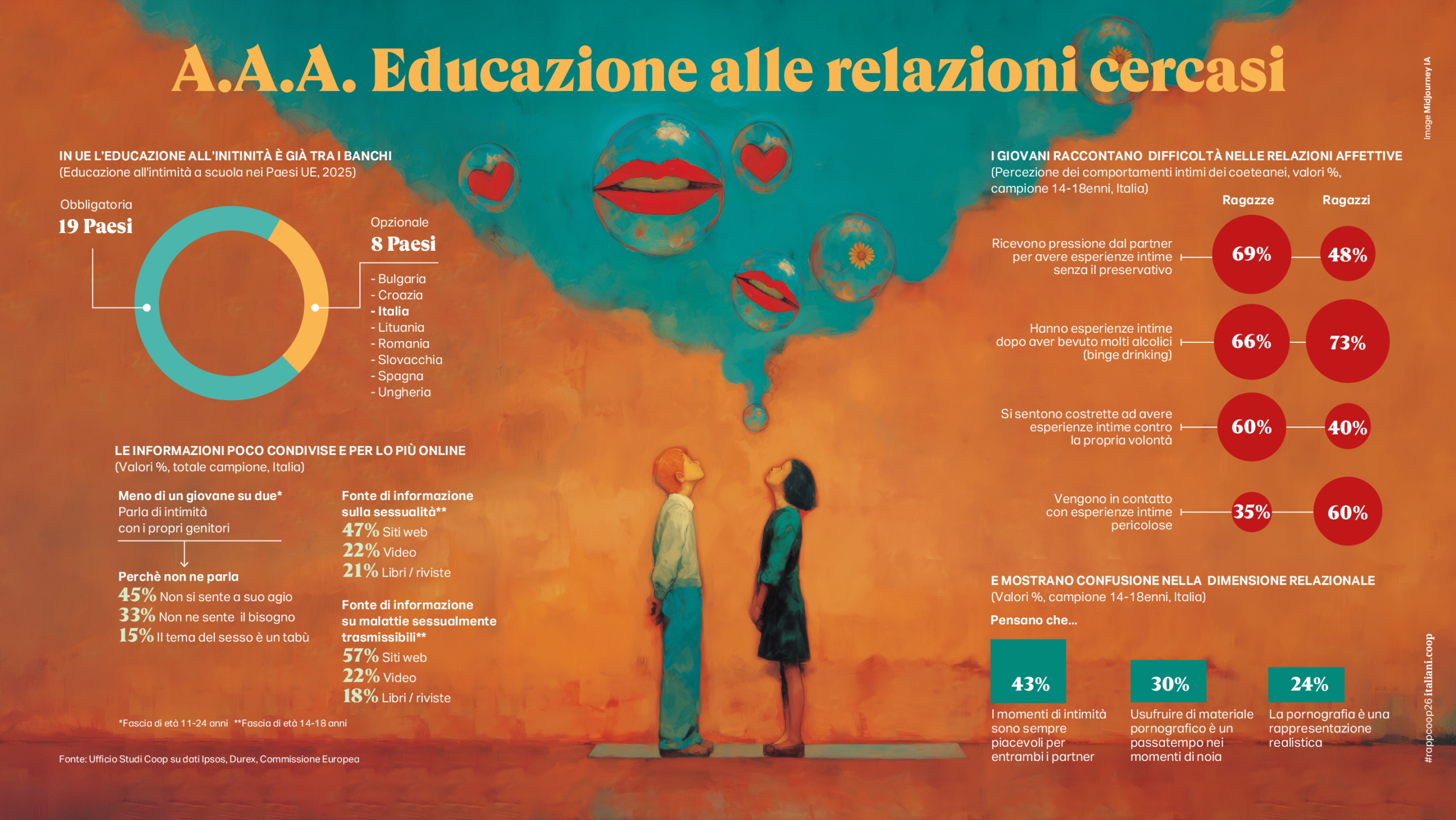Tra percorsi scolastici assenti e un dialogo familiare difficile, i giovani italiani si trovano a costruire da soli la propria educazione all’intimità, in modo frammentario e disorganico, alimentando comportamenti a rischio e percezioni distorte della realtà....
