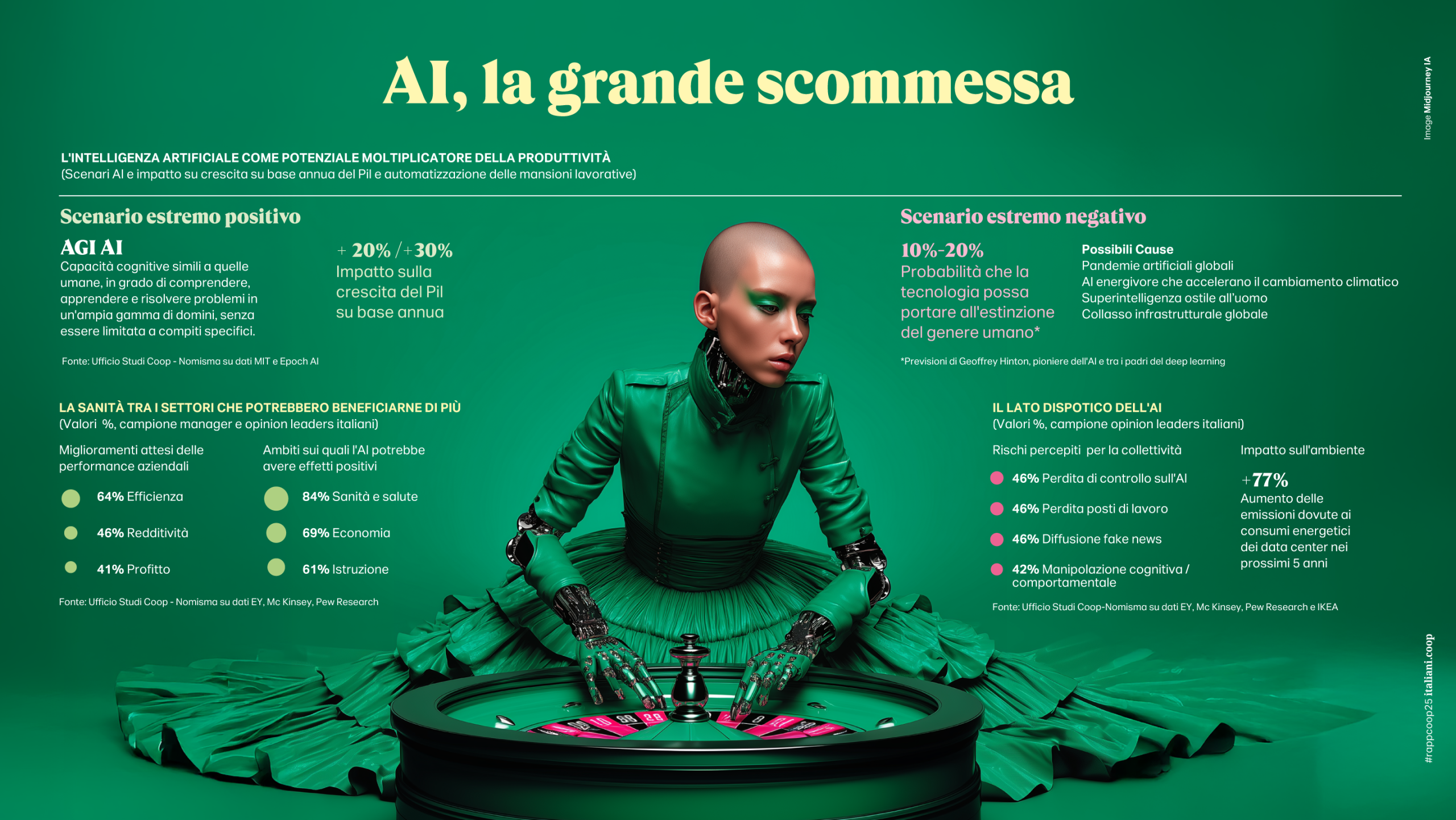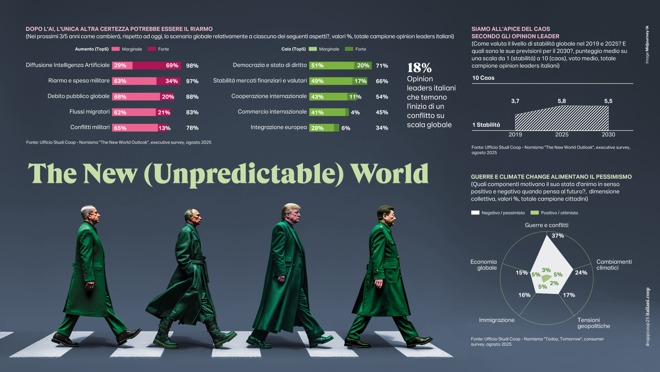 L’età del caos- Se è vero che negli ultimi anni abbiamo attraversato momenti di grandi perturbazioni e una costante volubilità, è altrettanto certo che mai come oggi il mondo (e il nostro quotidiano) si è fatto ancora più convulso e mutevole, sicuramente più pericoloso. Il conflitto è diventato la modalità prioritaria di risoluzione delle controversie internazionali; aumentano le guerre e la spesa militare (2,7 trilioni di dollari nel 2024, il 17% in più rispetto al 2022) si chiudono le frontiere e cambiano i rapporti di forza tra le potenze.  Uno scenario che non sembra peraltro arretrare, tanto che il 78% degli opinion leaders del Rapporto Coop prevede un aumento dei conflitti militari nei prossimi 3/5 anni e il 18% teme l’inizio di un conflitto su scala globale.