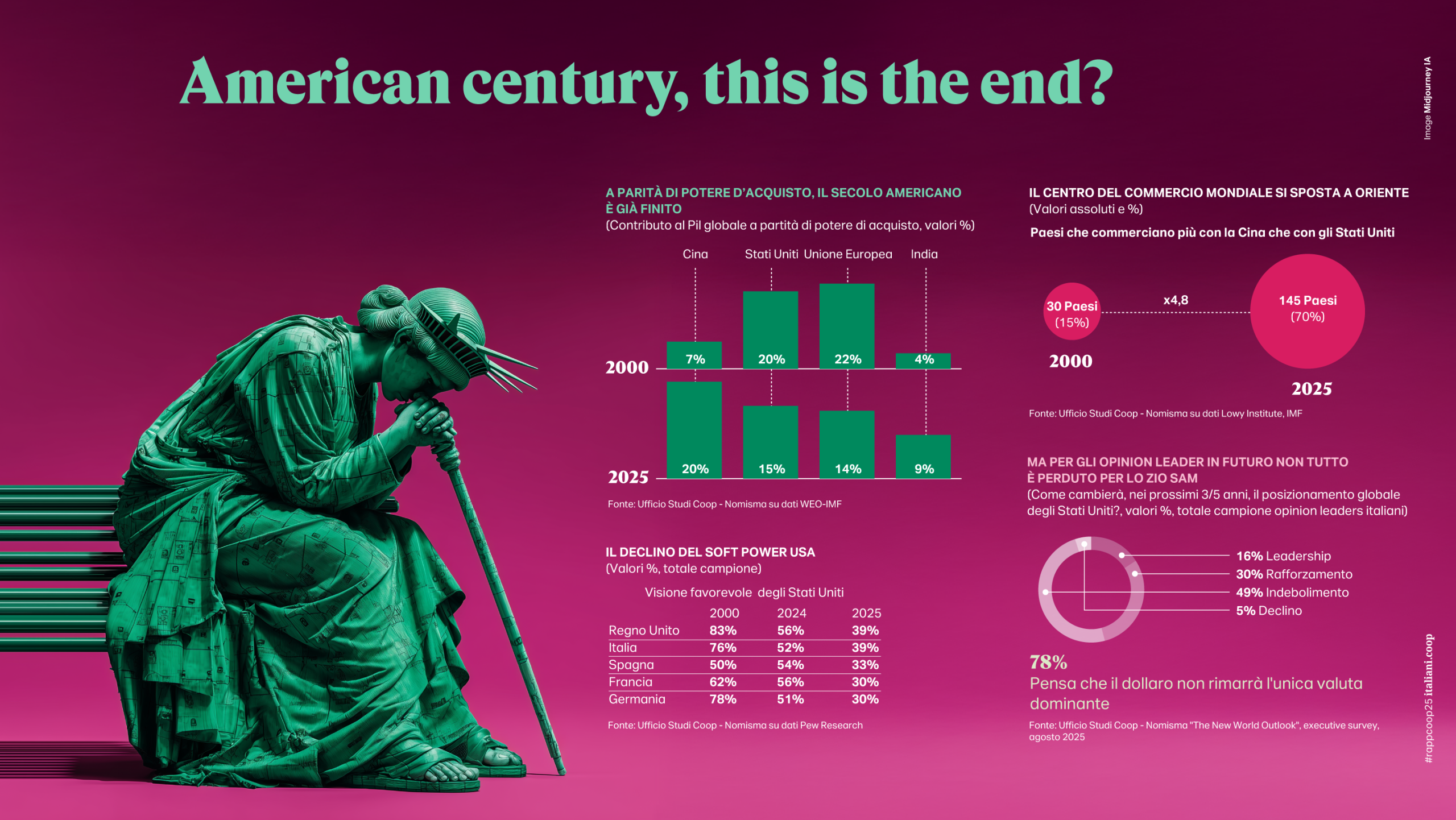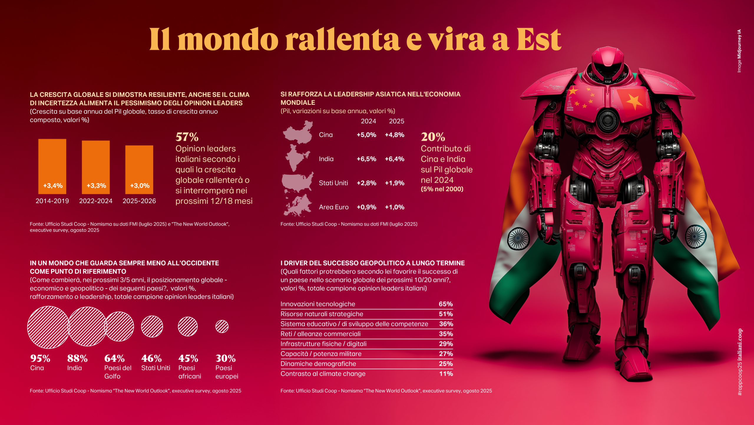 La stessa logica del conflitto dalla geopolitica si estende alle relazioni commerciali che con il Liberation Day sembrano segnare il declino della globalizzazione (la metà delle imprese esportatrici prevede un calo dei flussi commerciali nel 2025) e dei suoi effetti propulsivi sulla crescita mondiale. Malgrado le ambizioni di supremazia dell’amministrazione Trump in discussione appare soprattutto la leadership degli Usa, a partire dal softpower culturale e dalla centralità negli scambi internazionali, (negli ultimi 25 anni il numero di Paesi che commercializzano più con la Cina che con gli Stati Uniti è salito da 30 a 145), la stessa forza del dollaro si riduce nelle riserve monetarie internazionali e il debito pubblico americano oramai non è dissimile da quello italiano. Cresce invece la forza economica e culturale delle potenze asiatiche e del Sud del mondo che oggi per la prima volta si pongono in netta contrapposizione all’Occidente (nel 2025 la Cina viaggia su un tasso di crescita annuo del Pil intorno al +5%, l’India supera il +6% a fronte di un ben più modesto +1,9% degli Usa e +1% dell’UE).