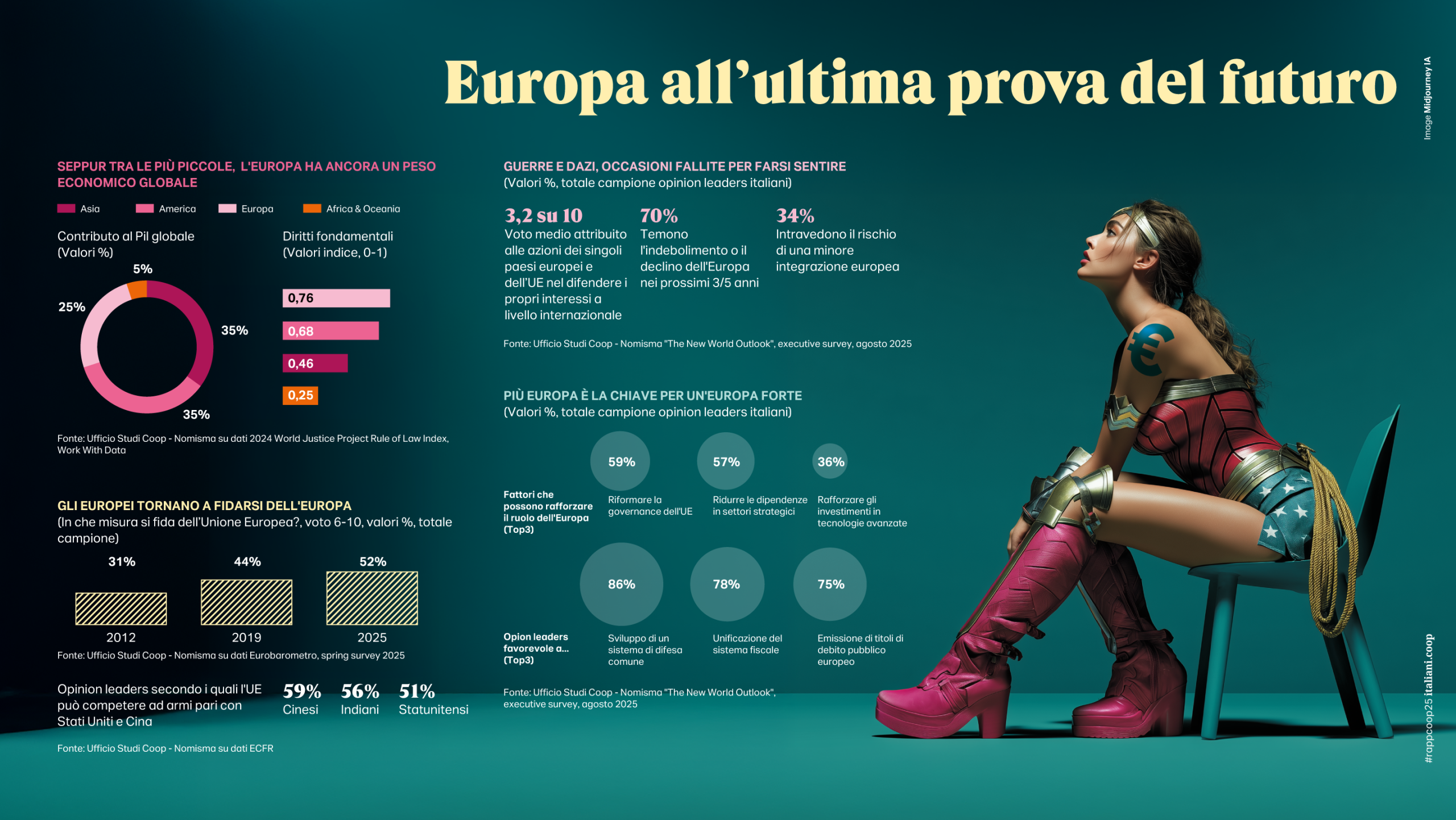 In questa nuova età del caos, l’Europa gioca di rimessa. A dispetto del suo indubbio peso economico (genera un quarto del Pil globale) e della sua tenuta sui diritti fondamentali rispetto alle pericolose tentazioni antidemocratiche di tanti altri Paesi, l’Ue resta ostaggio della sua governance incompiuta. Paradossalmente proprio quando la strisciante disillusione nei confronti delle istituzioni europee (la fiducia dei cittadini nell’UE passa dal 31% del 2012 al ben più solido 52% di oggi) non genera più approcci nazionalisti e  la grande parte degli opinion leaders intervistati nella survey rappresenta la necessità di un approccio finalmente federale: lo sviluppo di una difesa comune ad esempio (è favorevole l’86% del campione), l’unificazione del sistema fiscale (78%) e l’emissione di titoli di debito pubblico europeo (75%).