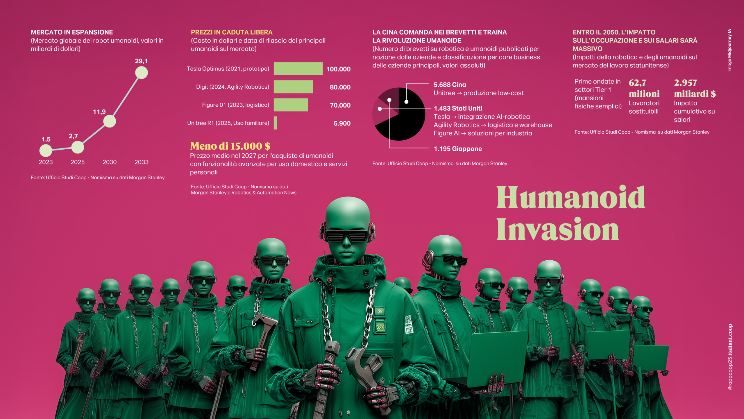 In questa inedita contesa per la leadership del mondo post-americano, gioca un ruolo cruciale la tecnologia, in particolare oggi per il controllo dello spazio e il dominio dell’AI che è la grande scommessa dei prossimi anni. Benché persistano ancora subbi e timori, per molti è considerata un moltiplicatore del progresso economico e sociale (gli incrementi del Pil annuale potrebbero arrivare a sfiorare un +20%-+30%) con una vera rivoluzione degli assetti economici e dei modelli di vita e di lavoro. Peraltro, se l’intelligenza artificiale ha sinora riguardato i business digitali e i prodotti dematerializzati, il prossimo avvento dei robot umanoidi potrà portare gli stessi effetti rivoluzionari nell’economia reale, dal manifatturiero ai servizi alla persona, a partire dal retail. E anche qui non a caso la Cina occupa un posto in prima linea sia come numero di brevetti (5.688 quelli depositati a fronte dei 1.483 degli Usa) che per l’economicità delle proposte: un umanoide con funzionalità avanzate per uso domestico e servizi personali costerà in previsione da qui a due anni meno di 15.000 dollari. Un mercato low cost in inevitabile espansione.