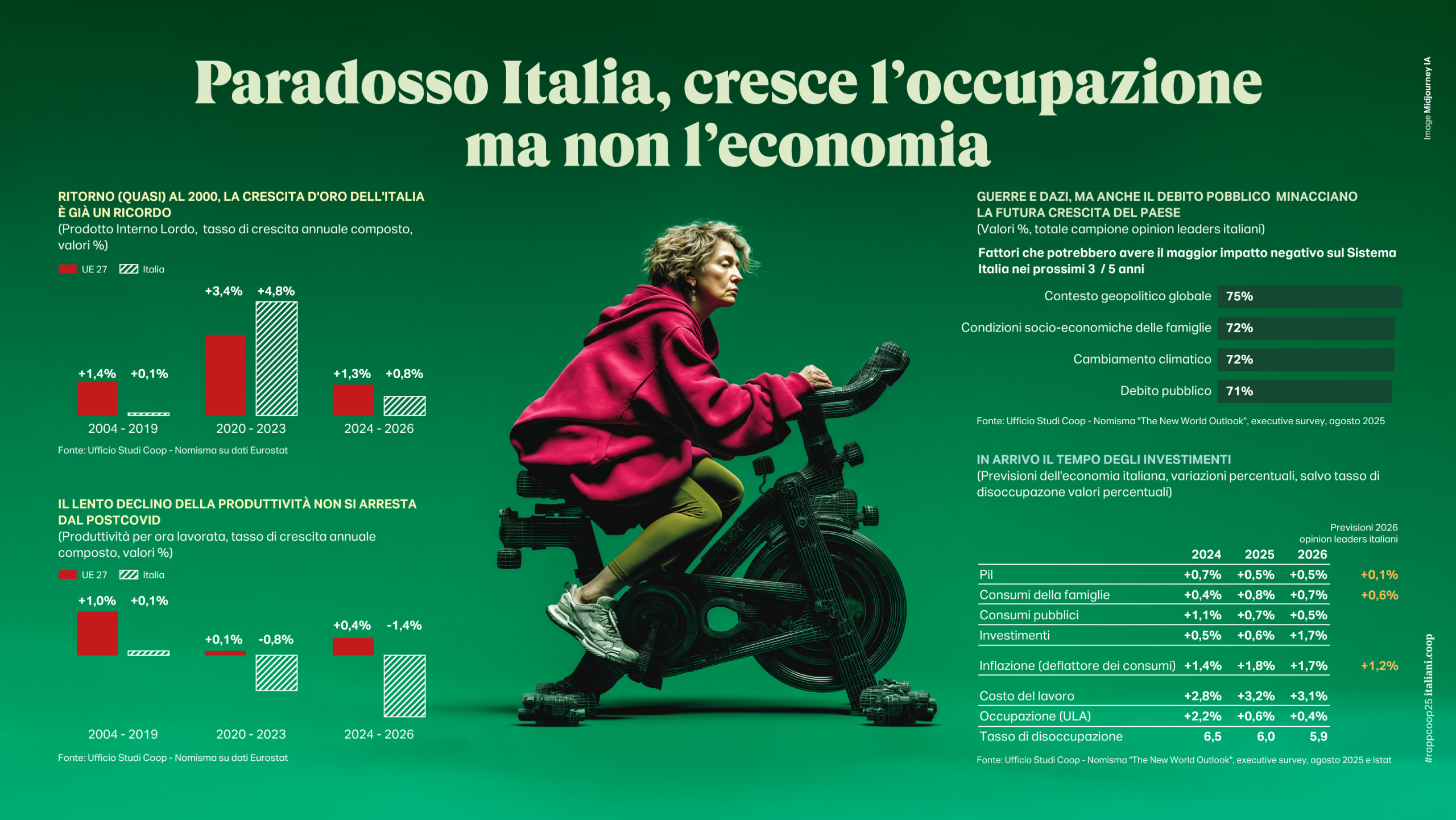 Mentre l’Italia, a dispetto di una stabilità politica e sociale che oggi la caratterizza positivamente nel confronto europeo, purtroppo dal punto di vista economico sembra aver definitivamente esaurito l’abbrivio della crescita record del periodo post pandemico. Così, le stime dei previsori macroeconomici individuano per il biennio 2025-2026 una crescita su base annua del Pil di mezzo punto percentuale, mentre le previsioni degli opinion leaders intervistati sono ancora più pessimistiche (+0,1% nel 2026). L’economia italiana torna al male antico di una produttività declinante. A fronte di un’occupazione in crescita (sono 840.000 i nuovi occupati), fa difetto all’Italia la produttività per ora lavorata che è prevista in decrescita fino al -1,4% in maniera opposta rispetto al resto d’Europa. Segno evidente dell’assenza nell’economia nazionale dei settori ad alto valore aggiunto e di conseguenza di un lavoro poco qualificato e meno pagato. Nei settori di impiego dei nuovi lavoratori troviamo infatti in maggioranza costruzioni, commercio, alberghi e ristoranti e fa impressione per converso il dato del titolo di studio; il numero di occupati con licenza media è sceso di oltre 647mila unità, a fronte di un aumento di 687mila diplomati e 800mila laureati. È proprio la mancata crescita della produttività a non far ripartire l’ascensore sociale, oramai fermo da anni. Basti pensare che il 10% della popolazione italiana detiene il 58% della ricchezza del Paese (peggio di noi solo i tedeschi) e a fruttare sono più le rendite (da finanza e da immobili) che il lavoro, soprattutto se è lavoro autonomo.