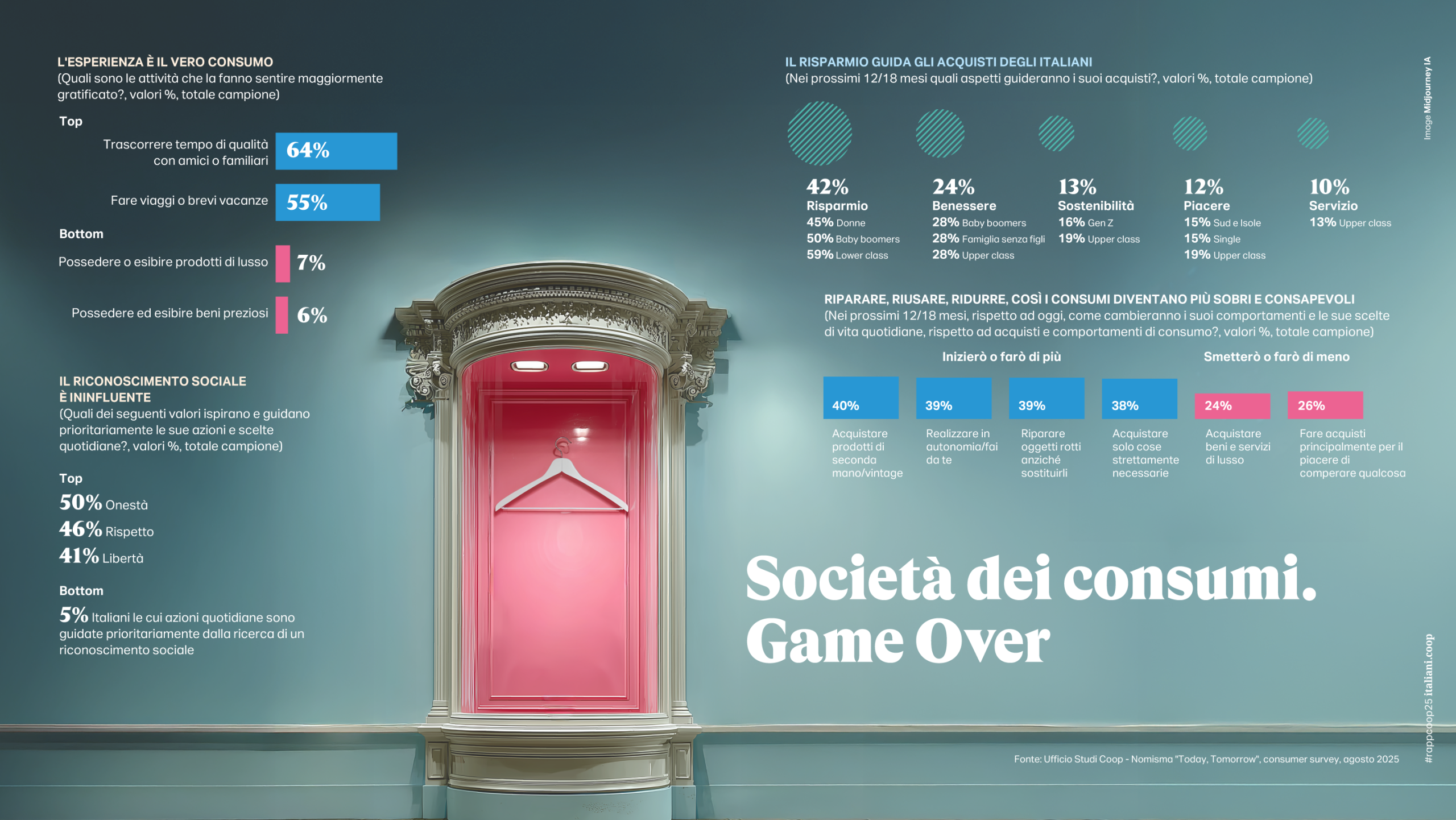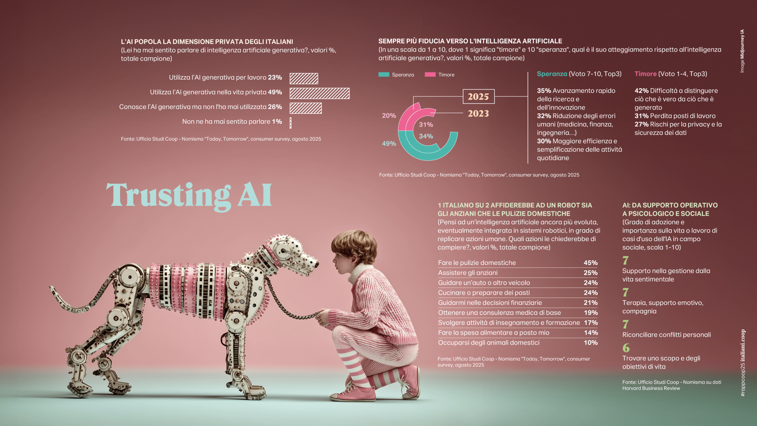 Grazie al loro maggiore impegno sul lavoro, gli italiani si scoprono nel 2025 sì meno vulnerabili (quelli che hanno vissuto situazioni di disagio durature su aspetti essenziali della vita di tutti i giorni sono diminuiti di 1 milione rispetto al 2023), ma si mantengono vigili e in precario equilibrio di fronte agli imprevisti ma anche alla quotidianità. Se è vero, infatti, che nel 2024 la spesa complessiva delle famiglie italiane è cresciuta del +0,5% rispetto a cinque anni fa, oltre la metà è assorbita dalle spese obbligate (abitazione, utenze domestiche, trasporti e cibo) e non si discostano da queste voci le intenzioni di acquisto per i prossimi 12-18 mesi. Il risparmio persiste come driver primario per il 42% degli italiani, ma a essere messa in discussione è l’essenza stessa della società dei consumi, pare oramai arrivato il tempo del deconsumismo. Al posto del piacere del possesso, l’Italia di oggi scopre il vero valore nelle esperienze di vita, acquista solo le cose indispensabili, ama il second hand e ripara gli oggetti piuttosto che sostituirli. E anche quando torna a spendere in acquisti tecnologici (16,5 miliardi di euro negli ultimi 12 mesi, +1,2% su base annua) lo fa privilegiando l’utilità alla gratificazione; tra i top ten delle vendite spiccano gli apparecchi per la cura dentale e una miriade di elettrodomestici piccoli o grandi che siano (dalle friggitrici alle macchine da caffè all’aspirapolvere). All’opposto si riducono gli acquisti di prodotti dell’elettronica di consumo (gli acquisti annui di smartphone si riducono di 2 milioni di unità rispetto al 2022). In modo simile gli italiani interpretano l’utilizzo che già stanno facendo dell’AI che ha invaso la dimensione privata (per il 49%) piuttosto che il contesto lavorativo (23%). Più confidenti oggi che in passato, sembrano preferirla ai social media nell’utilizzo del loro tempo quotidiano e, guardando al futuro, la immaginano come una valida alleata nella quotidianità: il 45% utilizzerebbe un’AI evoluta e robotica per compiere le pulizie di casa, il 25% gli affiderebbe l’assistenza degli anziani, il 24% la guida di un veicolo e la preparazione dei pasti. A metà, insomma, tra l’amica del cuore, un maggiordomo o una badante.
