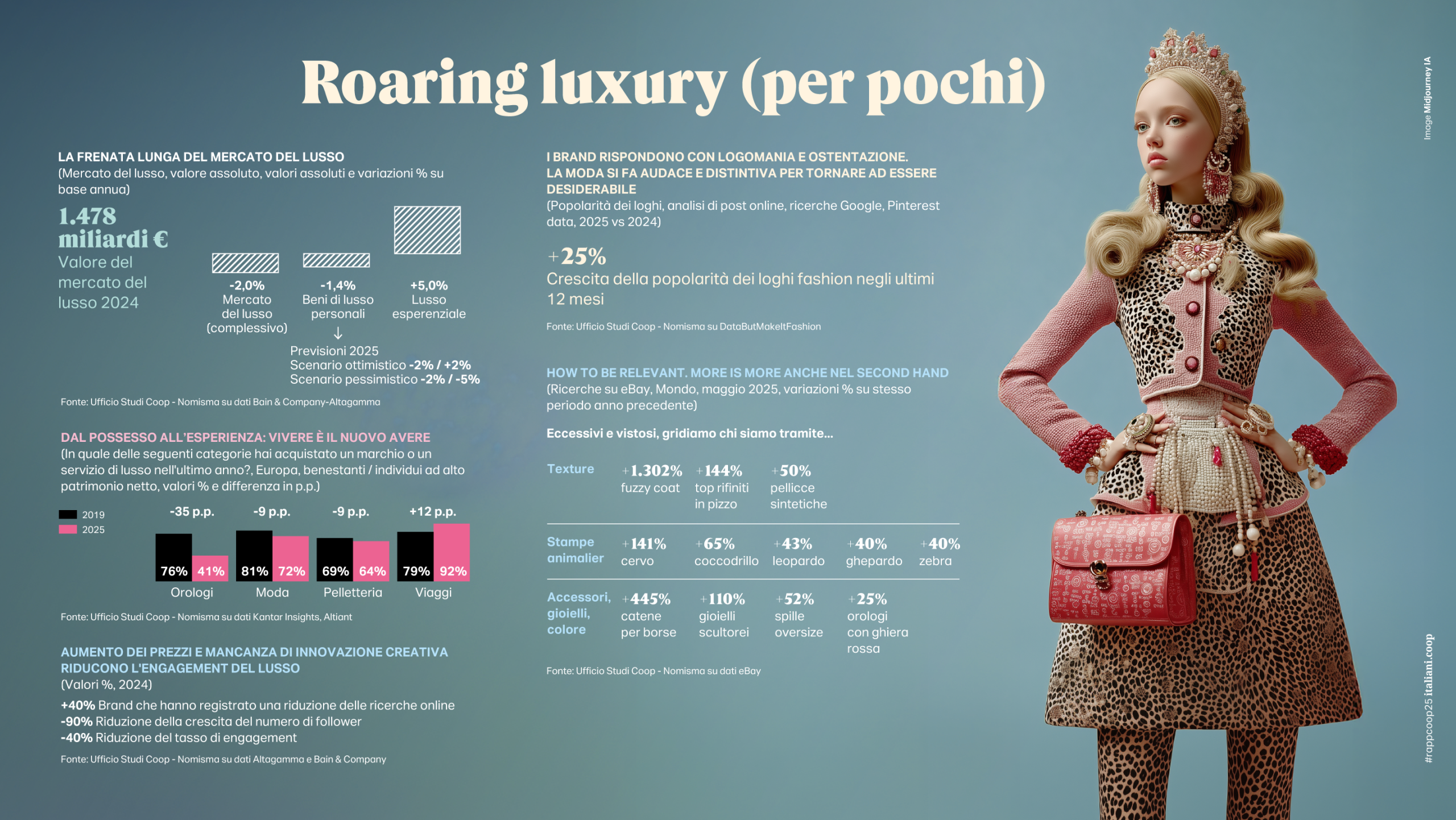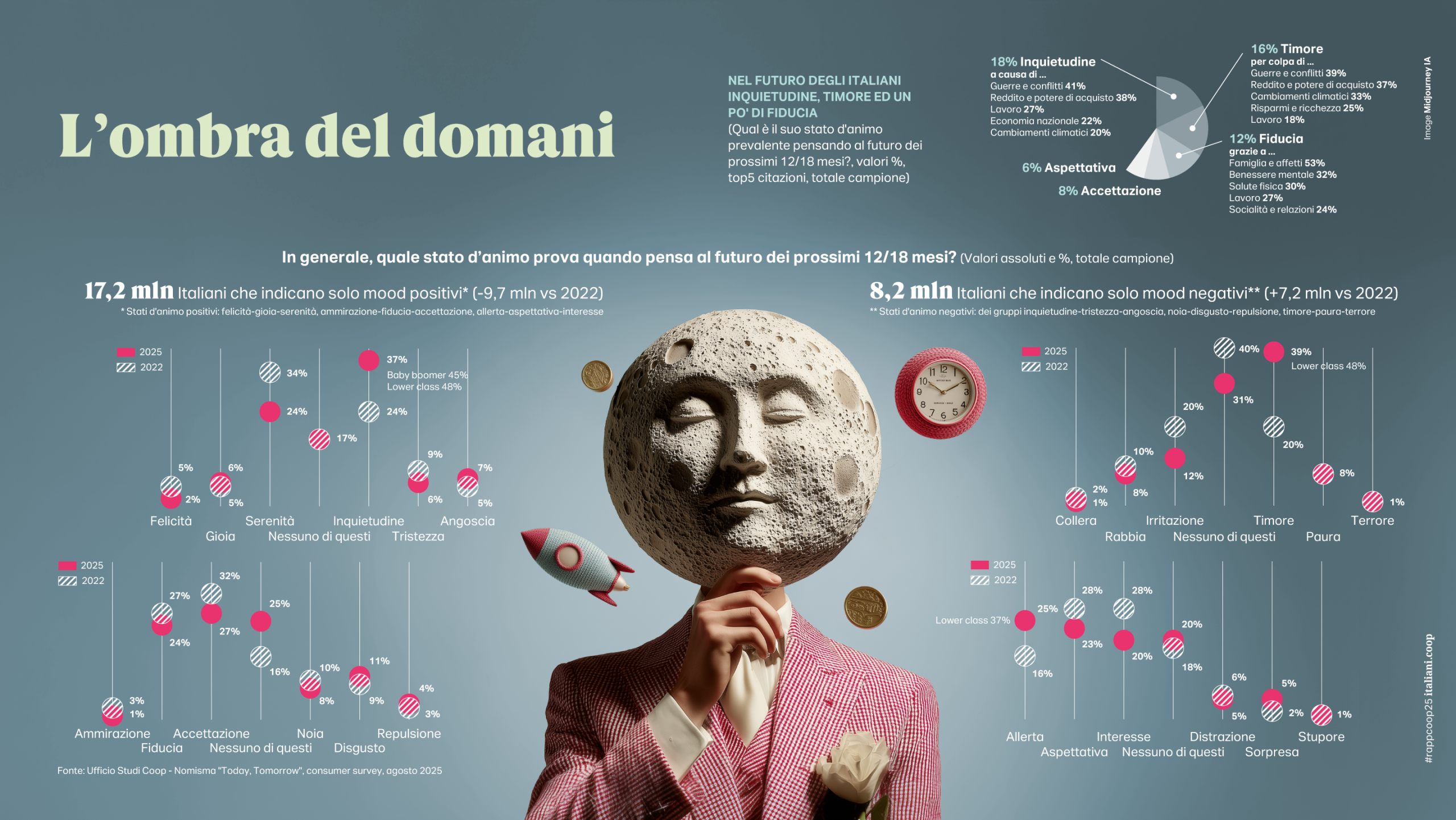 In un mondo che brucia tra guerre e instabilità, gli italiani tornano a fare i conti con la paura del domani. Per la prima volta dopo la pandemia, l’incertezza sul futuro prevale nettamente. Si stringono i denti contro l’inflazione, ma il Paese resta tra i più fragili d’Europa. Il mito del consumismo si sgretola e, nel suo crepuscolo, resistono soltanto due simboli identitari: le esperienze e il cibo. La longevità si costruisce a tavola con frutta e verdura e se serve qualche aiuto medico, in una transizione dalla tradizione all'innovazione culinaria.