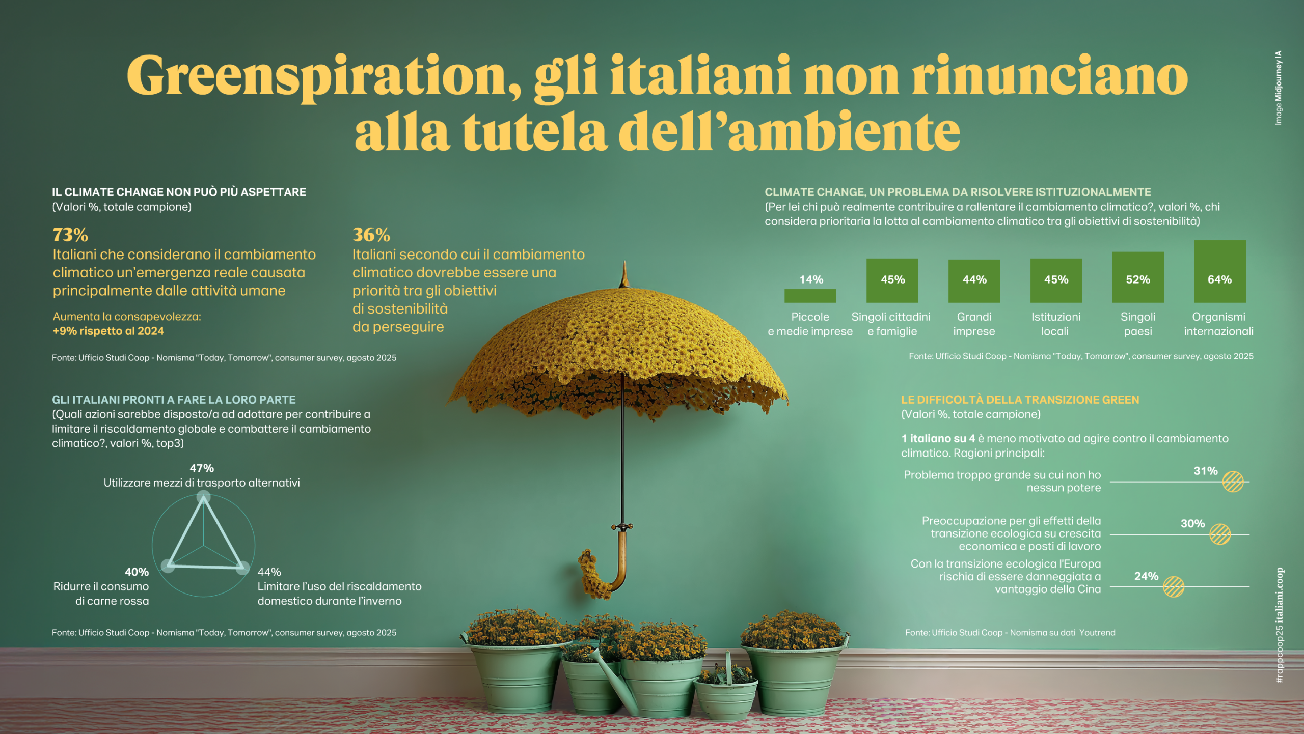 Peraltro, in un generale greenlash istituzionale e imprenditoriale (per il 60% dei manager europei la burocrazia ambientale è uno dei principali ostacoli alla competitività), resta invece alta l’attenzione degli italiani su questo tema: il 73% lo considera un’emergenza causata da attività umane e si dichiara disposto a fare la sua parte con comportamenti idonei (mezzi di trasporto alternativi, limiti all’uso del riscaldamento domestico, riduzione del consumo di carne rossa).