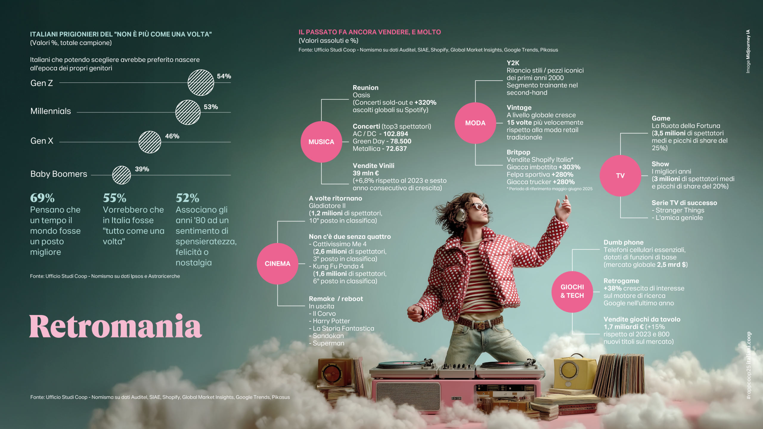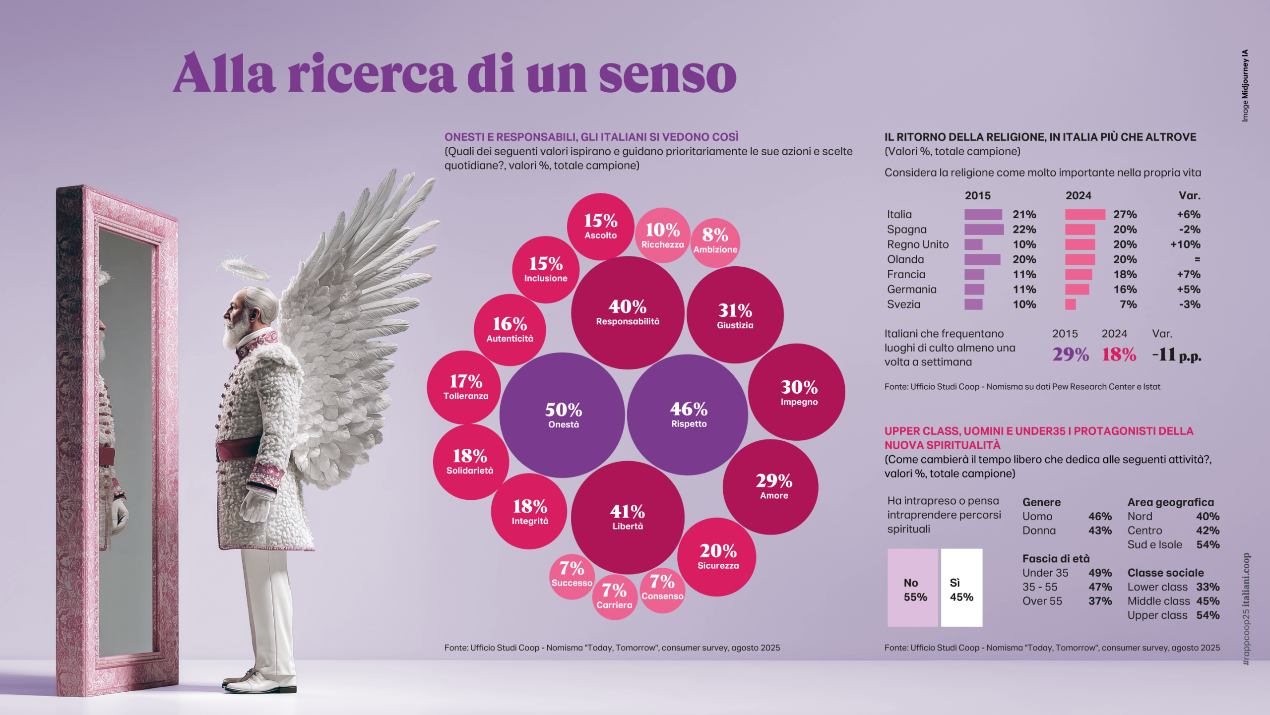 Questo repentino cambiamento nello stato d’animo degli italiani sembra preconizzare un più profondo cambiamento nel loro sistema valoriale e, nell’immediato, un ripensamento dei loro stili di vita. Gli italiani si autorappresentano guidati da valori di onestà (50%), rispetto (46%) e invece ormai molto meno interessati alla ricchezza (10%), successo sociale e carriera (ex-equo al 7%), forse anche perché oramai ritenuti indisponibili. Dopo anni di spinta laicista riemerge dunque l’importanza della religione nel nostro Paese più che nel resto d’Europa (superiamo anche la cattolicissima Spagna) e più in generale il ricorso a percorsi di spiritualità; ammette di averli intrapresi o di avere intenzione di farlo il 45% degli italiani, soprattutto uomini e under 35. L’immaginario collettivo si nutre anche di riferimenti nostalgici ai decenni precedenti; mentre impazzano i remake televisivi e cinematografici, crescono esponenzialmente le vendite di vinili e il vintage come icona. Il 54% della Generazione Z dichiara che potendo scegliere avrebbe preferito nascere all’epoca dei propri genitori. Un tuffo nel passato che consola, tanto che 7 italiani su 10 pensano che un tempo il mondo fosse un posto migliore.