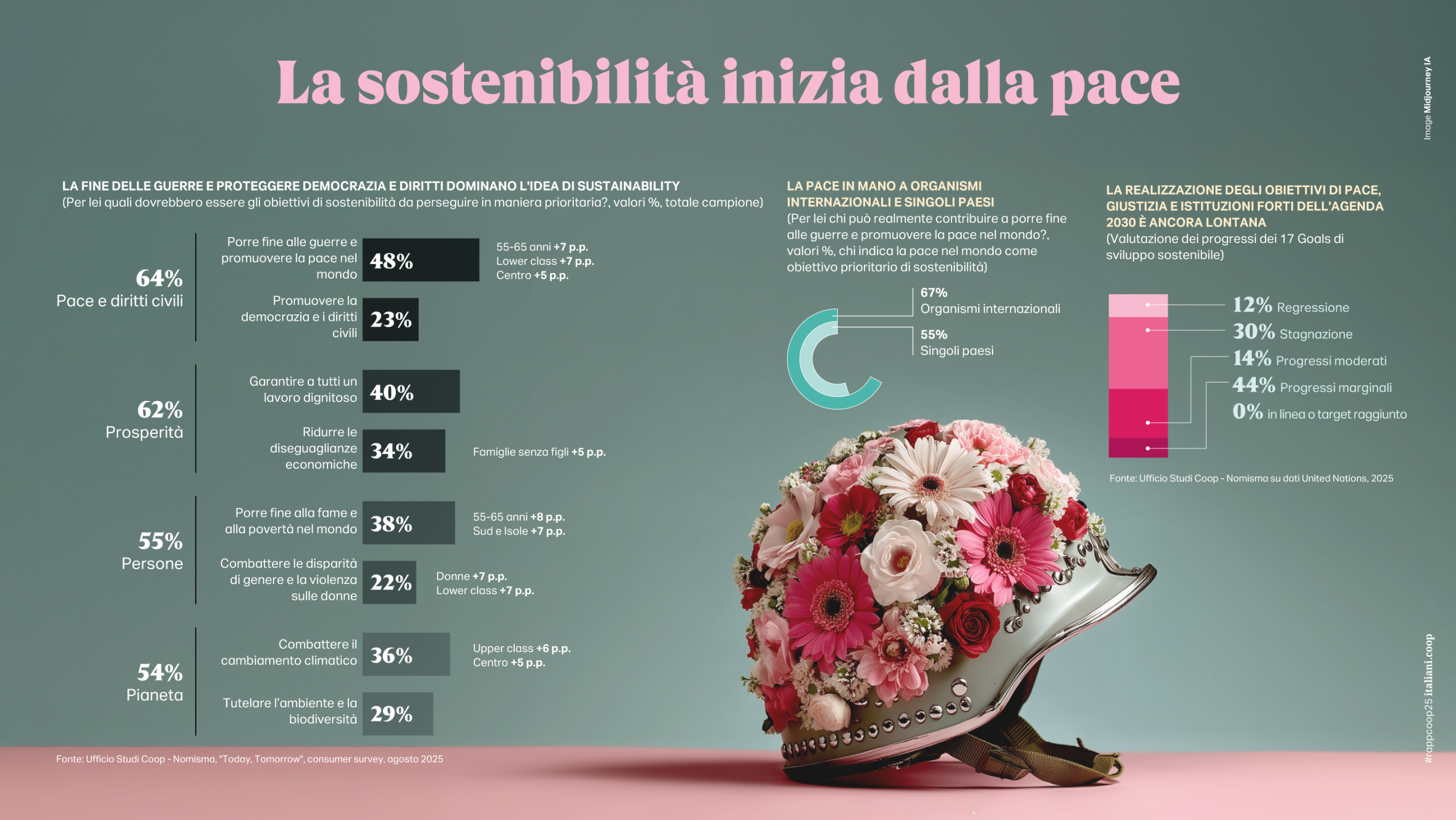 L’ombra del domaniLa preoccupazione è il nuovo mood degli italiani. Abbandonata l’imperturbabile serenità e la fiducia caparbia che avevano ostentato negli anni difficili della pandemia e del post-Covid, negli ultimi mesi, gli italiani sembrano aver intuito i molti rischi dello scenario e vedono allungarsi un’ombra sul loro domani. Rispetto al 2022 cresce il timore (dal 20% al 39%), prende quota l’inquietudine (dal 24% al 37%) e l’allerta (dal 16% al 25%), mentre si riducono repentinamente serenità (dal 34% al 24%) e fiducia (dal 27% al 24%). Nel mindset degli italiani certo restano le difficoltà quotidiane e la voglia di maggiori redditi, ma nell’immaginario collettivo è soprattutto la guerra a segnare la più ampia discontinuità (una buona metà dei nostri connazionali ha iniziato a accettare la possibilità di un conflitto armato) e non stupisce che tra i diversi obiettivi di sostenibilità si affermino prioritariamente istanze di pace e diritti civili (64% degli intervistati) e quelle relative ad una maggiore attenzione e cura delle persone attraverso il contrasto alla fame e alla povertà e alle differenze e violenze di genere (lo chiede il 55%) anche sopravanzando la garanzia per tutti di un lavoro dignitoso e della riduzione delle disuguaglianze (62%) e gli stessi temi ambientali e del cambiamento climatico.