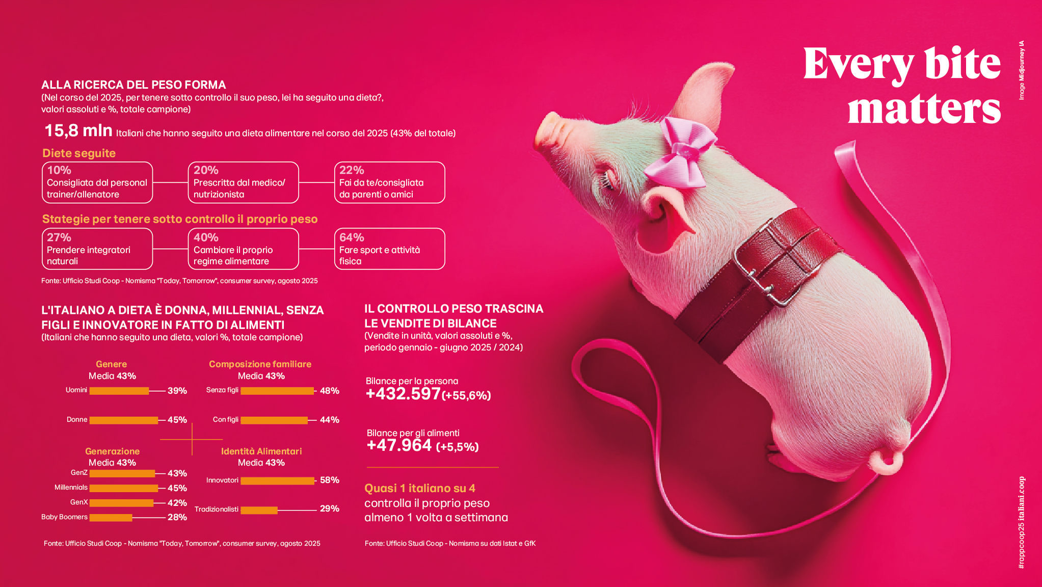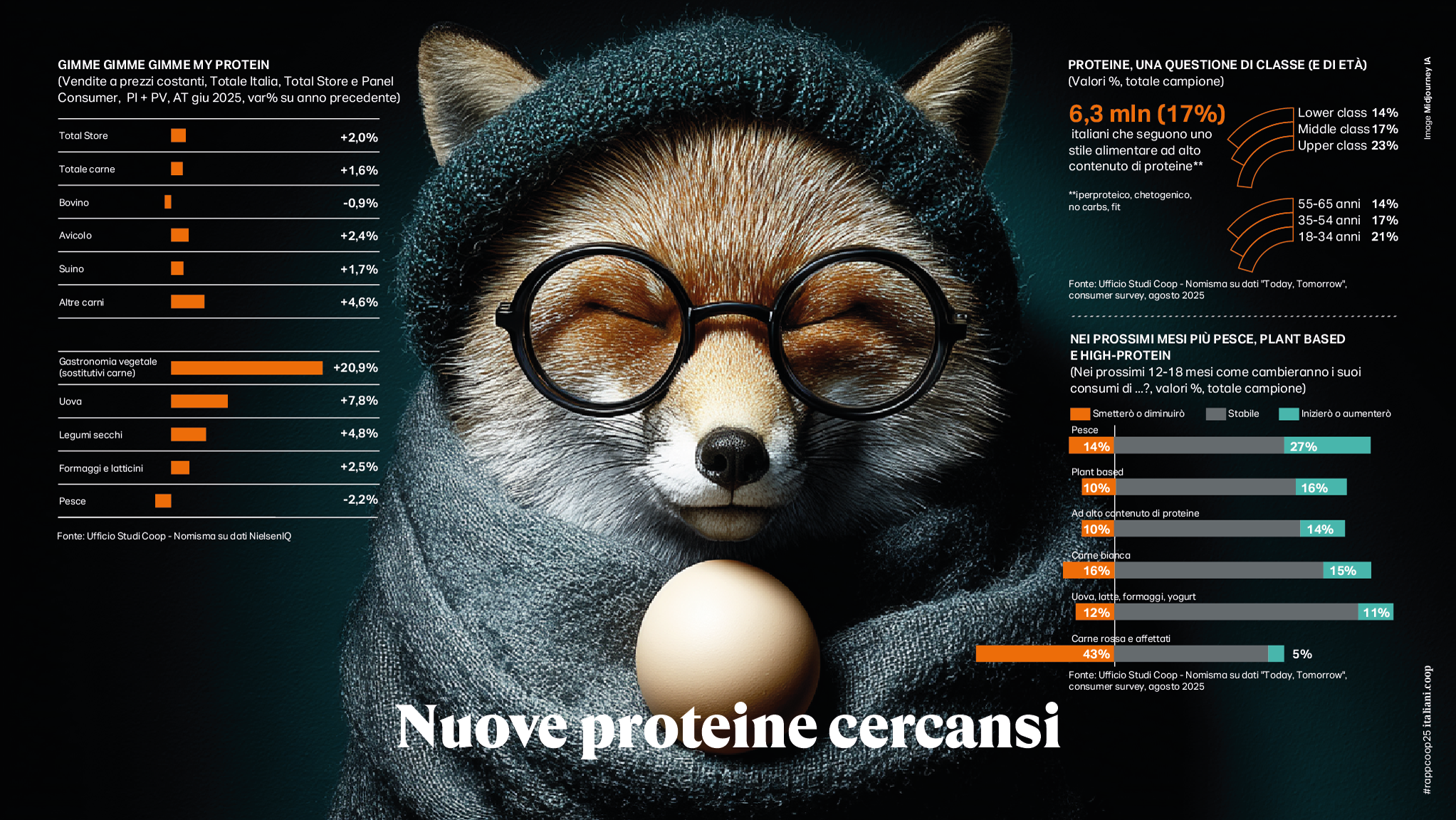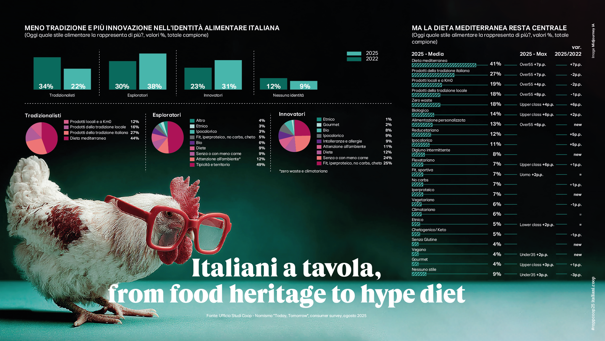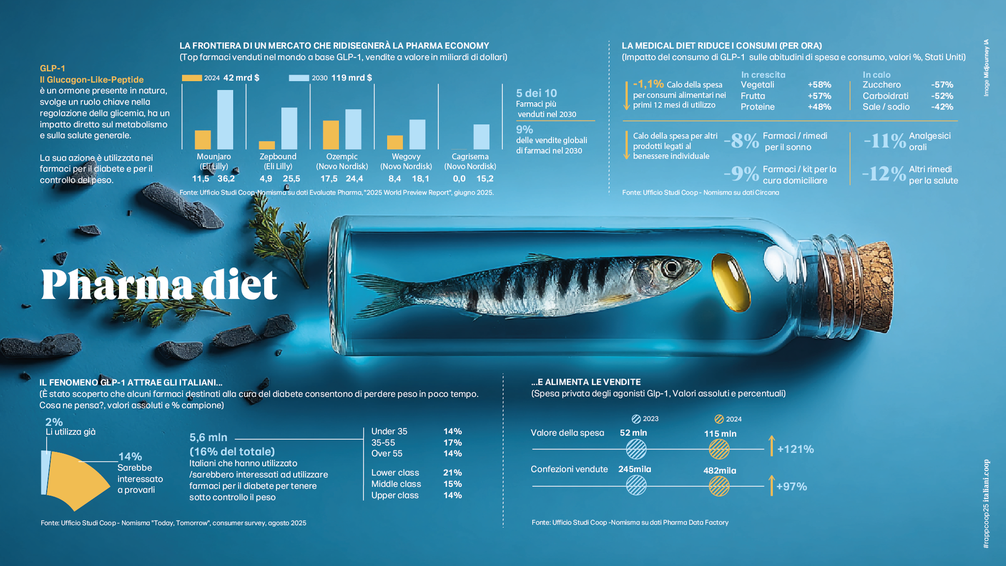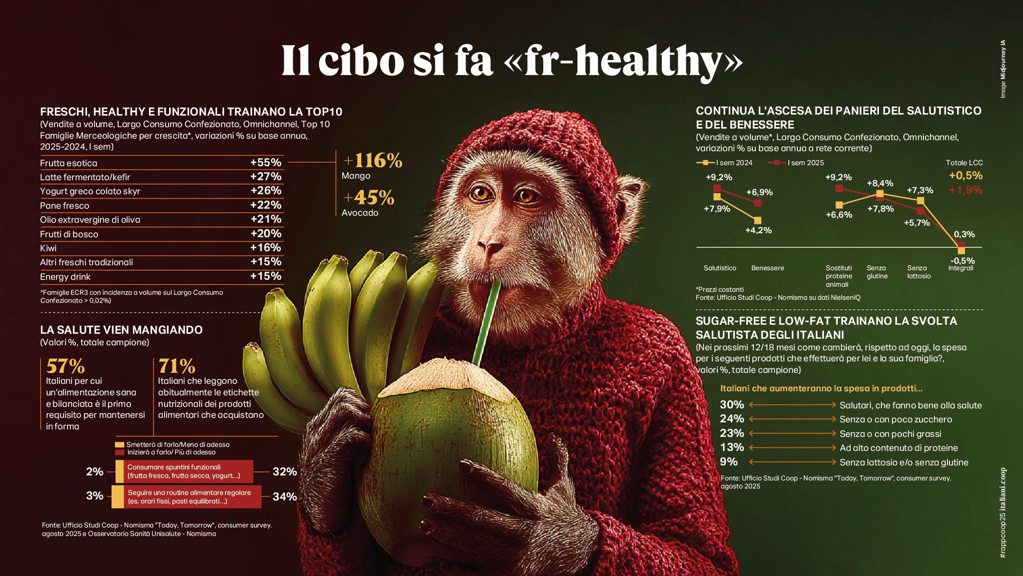 L’eterna rinascita del cibo- In un momento di convulsi cambiamenti, muta ancora (ma resta privilegiato) il rapporto degli italiani con il cibo. Quel ripensamento profondo del proprio sistema valoriale e delle scelte quotidiane si ritrova riflesso nel modo in cui gli italiani si rappresentano a tavola. Rispetto al 2022 gli italiani che si identificano con un’identità alimentare ancorata esclusivamente alla tradizione scendono dal 34% al 22%, mentre cresce la percentuale di chi autodefinisce il proprio stile associandolo esclusivamente a abitudini alimentari innovative (dal 23% al 31%) o mixa tradizione e innovazione (dal 30% al 38%). Una miscellanea di comportamenti a tavola per un cibo che, oltre a divenire palestra di sperimentazione, ritorna ad essere soprattutto cibo domestico e cibo cucinato. Nei primi 6 mesi del 2025 la spesa reale per la ristorazione fuori casa cala di un -2,2% e un italiano su 3 vi rinuncerà ulteriormente nei mesi a venire. Contestualmente si registra una ripresa importante nei carrelli della spesa; le vendite a valore e a volume nella grande distribuzione crescono rispettivamente di un +3,8% e di un +2% nei primi sei mesi dell’anno. A fare da traino frutta e verdura e altri comparti del fresco; gli italiani sembrano non poter rinunciare più ad un cibo salutare e 7 su 10 dichiarano di leggere abitualmente le etichette nutrizionali dei prodotti che acquistano. I carrelli si riempiono così di frutta esotica, latte fermentato, pane, yogurt, olio, meno zucchero, meno sale, meno carboidrati e sono i cibi ultraprocessati a perdere appeal; più compaiono additivi in etichetta e più diminuiscono le vendite. In questo trend accelera anche il biologico con una crescita delle vendite a valore molto importante anche nel sud d’Italia; sono poi 8,4 milioni gli italiani che nei prossimi mesi aumenteranno questi acquisti. La svolta salutista inoltre non può non comprendere anche il no-alcohol che avanza, soprattutto fra i giovani: 15,4 milioni di italiani preferiscono una bevanda analcolica anche quando possono scegliere. Perfetto controaltare di questi comportamenti è il fatto che il cibo ha acquisito nella percezione corrente e maggioritaria una funzione di alleato della salute da perseguire ad ogni costo; la longevità si conquista a tavola, certo, ma non si disdegna nemmeno l’utilizzo di farmaci ad hoc. Il 16% degli italiani ha già utilizzato o sarebbero interessati a provare farmaci per il diabete che hanno anche un impatto diretto sul metabolismo e dunque tengono il peso sotto controllo. Ogni grammo conta e il controllo peso che quasi 1 italiano su 4 fa almeno una volta a settimana può spiegare il vero e proprio boom di vendite delle bilance sia per la persona che per gli alimenti. Le prime registrano un aumento esponenziale nei primi sei mesi dell’anno pari a oltre il +55% (ne sono state vendute oltre 432.000 in più), le seconde si attestano su un +5.5%. Il mantra del perdere peso spiega anche l’altra grande passione degli italiani ovvero la dieta iperproteica che già coinvolge il 17% della popolazione, con le vendite dei sostitutivi vegetali della carne che nell’ultimo anno crescono del +20,9% (10 volte di più delle carni stesse), seguite da uova (+7,8%) e legumi (+5,0%).