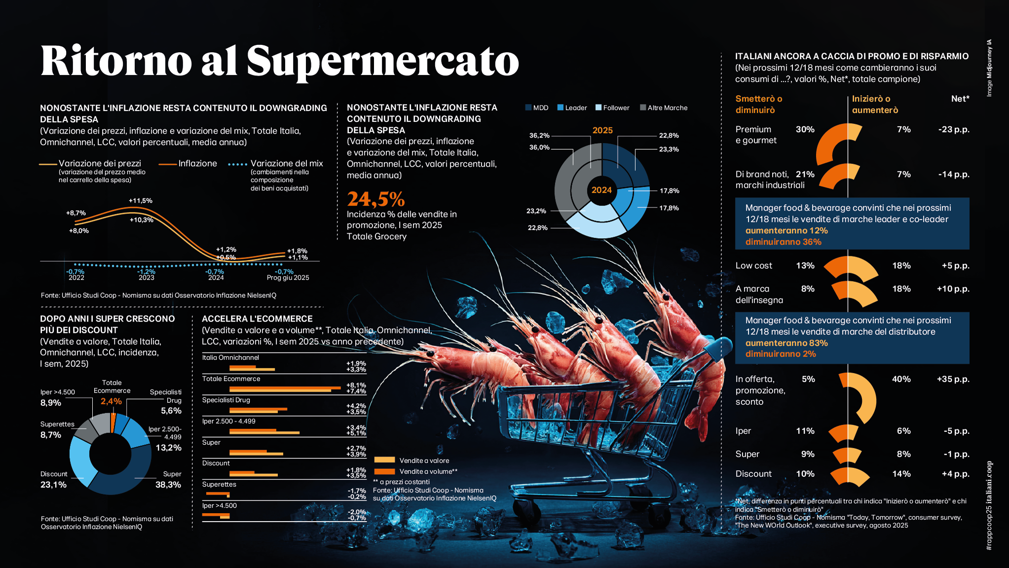 Seppure l’inflazione alimentare sia meno alta nel nostro Paese che nel resto d’Europa (nei primi sette mesi del 2025 la crescita è stata del +3,1% su base annua e del +29,1% rispetto al 2019 a fronte di una media Ue rispettivamente del +3,3% e del +38,5%), le persistenti difficoltà reddituali degli italiani fanno sì che resti alta anche a tavola la ricerca del risparmio e di soluzioni di maggiore convenienza. Questa ricerca sembra rivolgersi però in minor misura all’utilizzo del discount che nel primo semestre 2025 registra una crescita a volume del +1,8%, ma piuttosto agli scaffati dei supermercati che mettono a segno un +2,7% dove gli italiani prediligono i prodotti in promozione e quelli a marchio del distributore. Infatti, il 40% degli italiani inizierà o aumenterà l’acquisto di prodotti alimentari in offerta/promozione (mentre solo il 5% smetterà o diminuirà); il 18% acquisterà più prodotti a marca del distributore, più del doppio rispetto a quelli che aumenteranno l’acquisto di marchi industriali (9%). Per stare al passo con queste evoluzioni, la grande distribuzione italiana dovrà affrontare (e vincere) la sfida del futuro che, secondo le opinioni dei manager food & beverage della survey, passa in larga parte dall’innovazione di prodotto e di processo (lo dice il 53%) ma include anche adeguate politiche per il personale (36%), aperura a partnership strategiche e contempla inevitabilmente l’AI a cui viene attribuito un 20% di potenziale di produttività nell’arco dei prossimi 10 anni. La sfida è solo agli inizi.