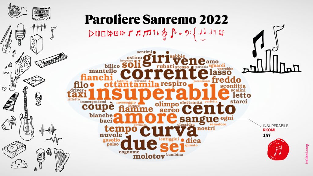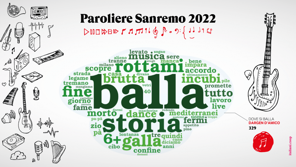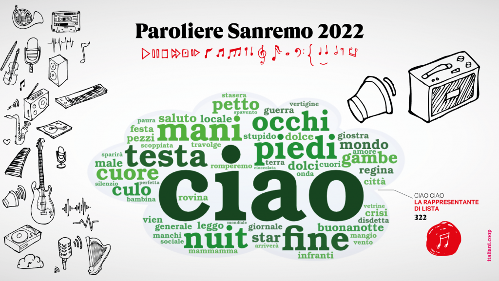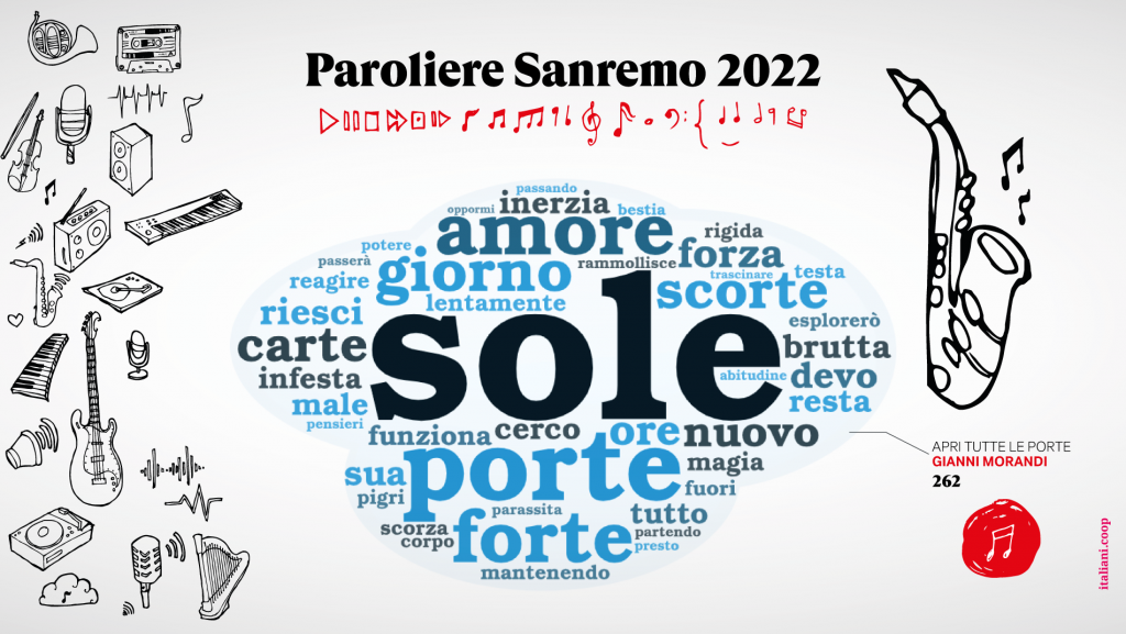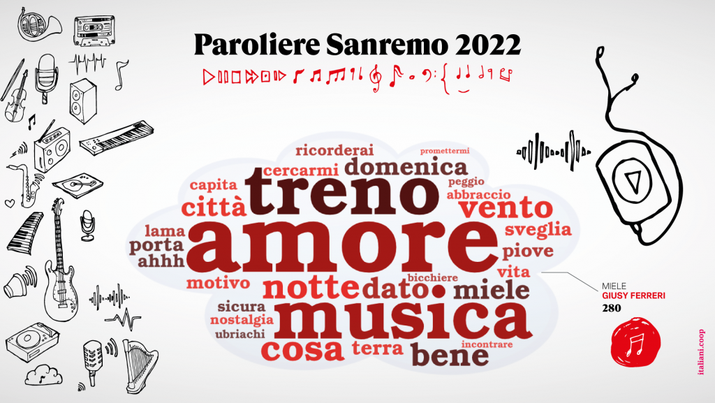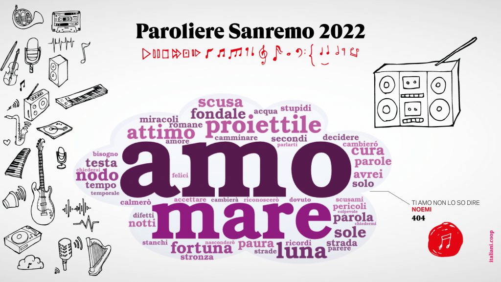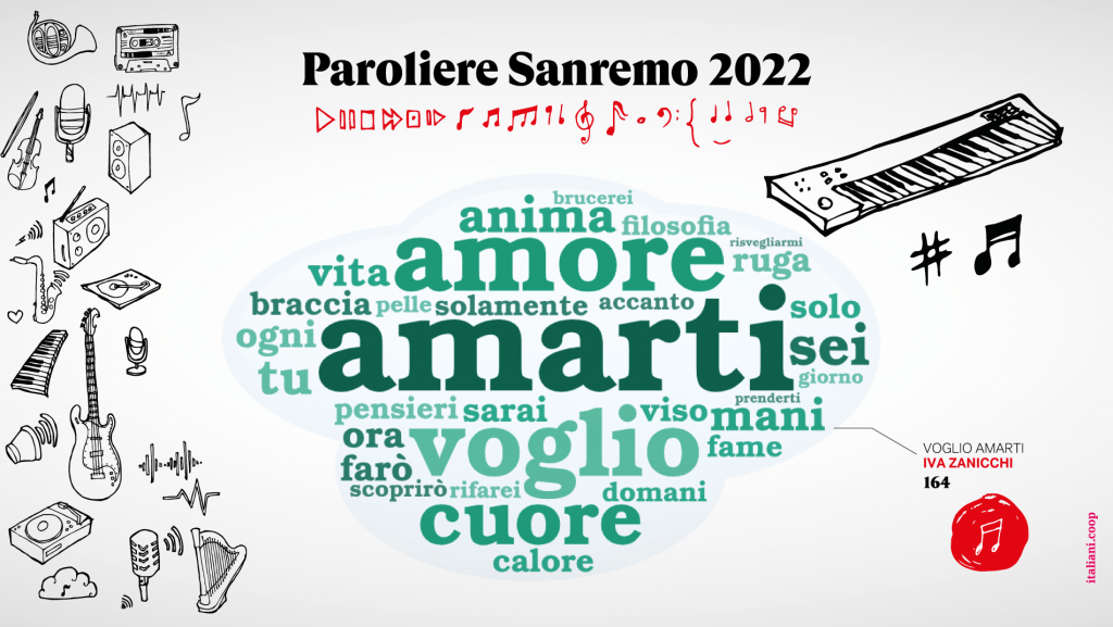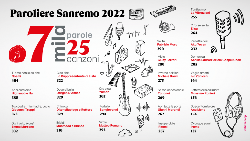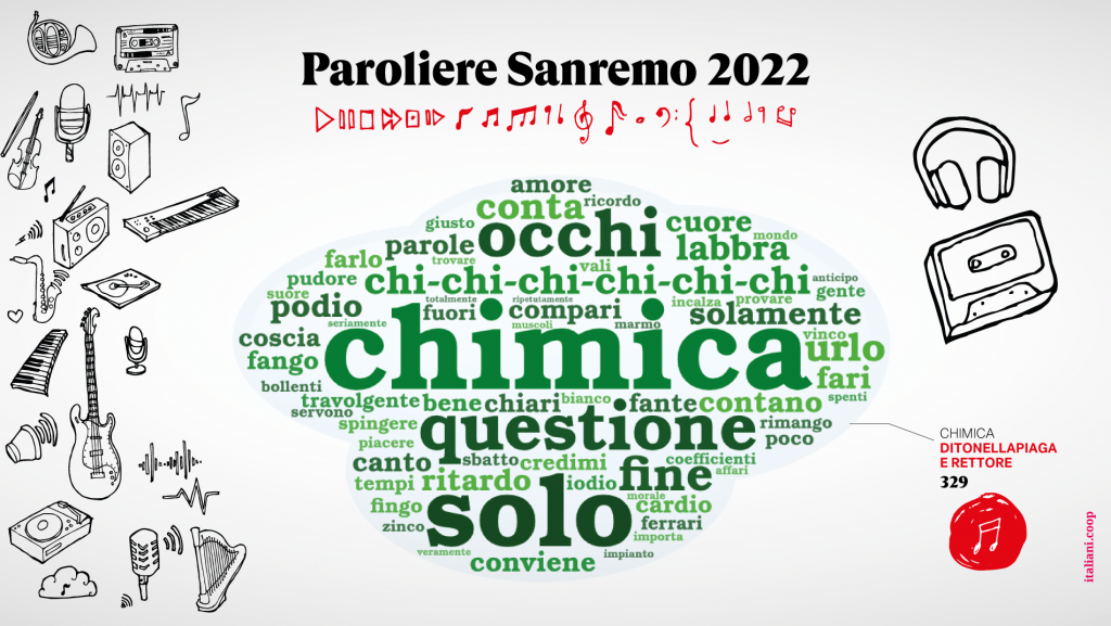 L’amore torna protagonista nei testi delle canzoni in gara per la 72ma edizione del Festival di Sanremo. L’importante è non farsi trarre in inganno dalla nuvola di parole dei 25 testi (uno per ogni cantante in gara ) in cui spicca la parola chimica . E sì, perché la canzone di Ditonellapiaga e Donatella Rettore è comunque un inno all’amore parlando della chimica che attrae due corpi umani. La seconda parola che emerge nella cloud è amore, come nelle migliori tradizioni sanremesi, e poi le più svariate occhi, mani, amarti cuore…Un Festival della canzone italiana meno prolisso anche per il calo del numero dei partecipanti raggruppati in questa edizione in un’unica categoria Artisti. 6876 le parole utilizzate dai concorrenti (meno rispetto alle oltre 10 mila del 2021 e 9975 del 2020, quando però concorrevano rispettivamente 34 e 32 cantanti). Ad aggiudicarsi il premio del più loquace Noemi con 404 parole nella sua Ti amo non lo so dire, palma d’oro invece per la capacità di sintesi ai 137 lemmi di Ovunque sarai di Irama. E anche se l’amore la fa da padrona, non manca la varietà in questa 72ma edizione come dimostrano le cloud delle 25 canzoni che abbiamo realizzato in occasione dell’evento.