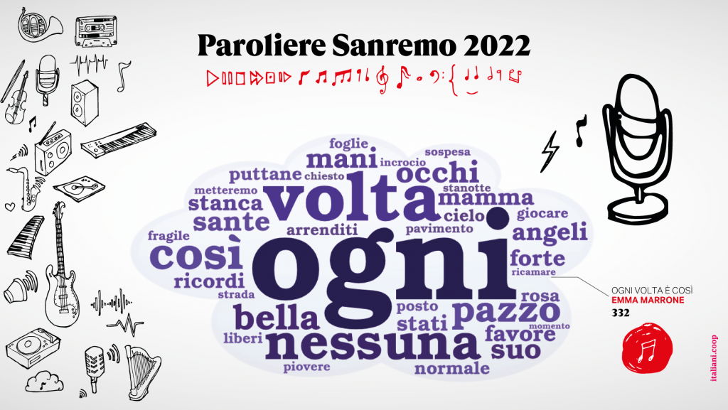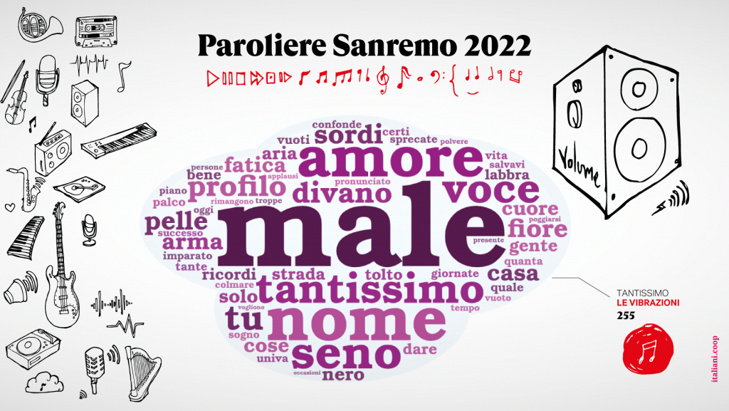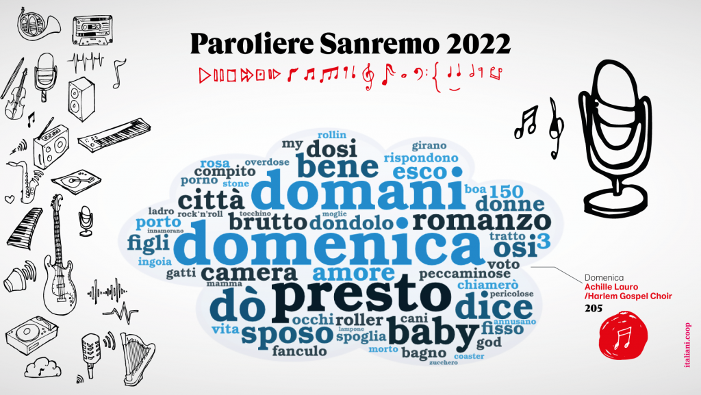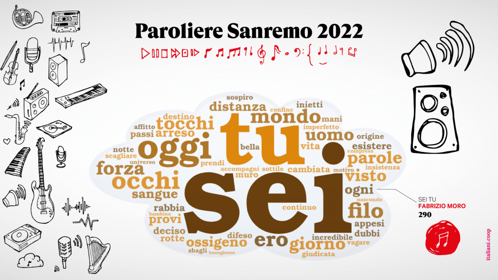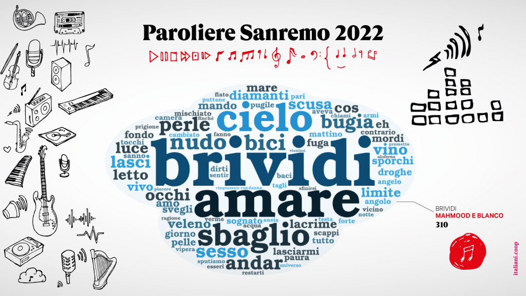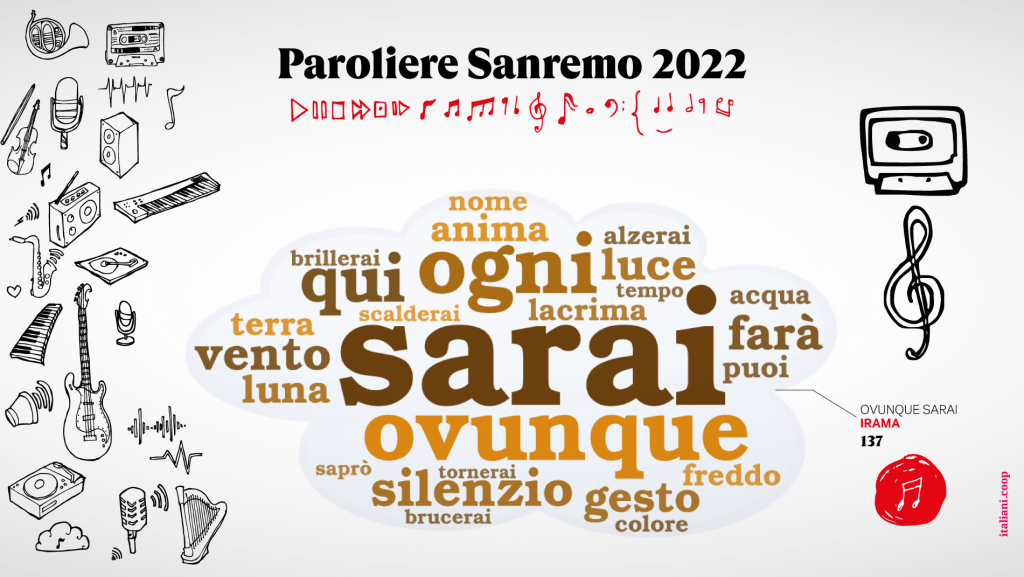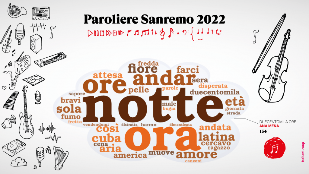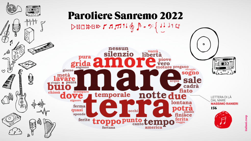 L’amore torna protagonista nei testi delle canzoni in gara per la 72ma edizione del Festival di Sanremo. L’importante è non farsi trarre in inganno dalla nuvola di parole dei 25 testi (uno per ogni cantante in gara ) in cui spicca la parola chimica . E sì, perché la canzone di Ditonellapiaga e Donatella Rettore è comunque un inno all’amore parlando della chimica che attrae due corpi umani. La seconda parola che emerge nella cloud è amore, come nelle migliori tradizioni sanremesi, e poi le più svariate occhi, mani, amarti cuore…Un Festival della canzone italiana meno prolisso anche per il calo del numero dei partecipanti raggruppati in questa edizione in un’unica categoria Artisti. 6876 le parole utilizzate dai concorrenti (meno rispetto alle oltre 10 mila del 2021 e 9975 del 2020, quando però concorrevano rispettivamente 34 e 32 cantanti). Ad aggiudicarsi il premio del più loquace Noemi con 404 parole nella sua Ti amo non lo so dire, palma d’oro invece per la capacità di sintesi ai 137 lemmi di Ovunque sarai di Irama. E anche se l’amore la fa da padrona, non manca la varietà in questa 72ma edizione come dimostrano le cloud delle 25 canzoni che abbiamo realizzato in occasione dell’evento.