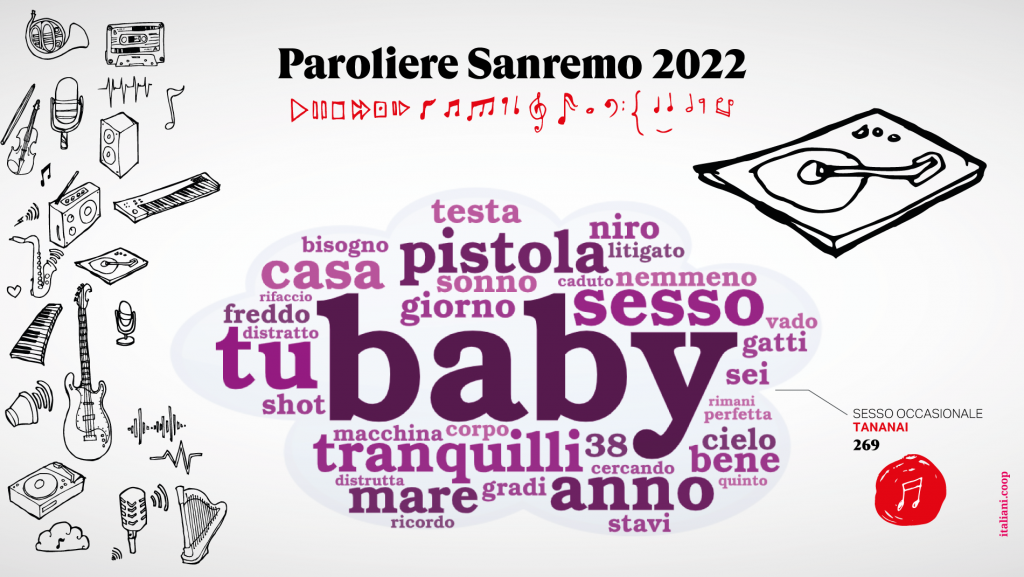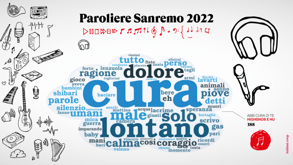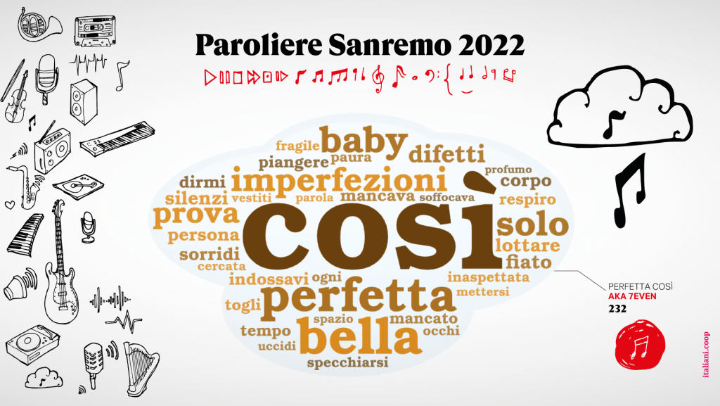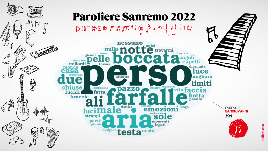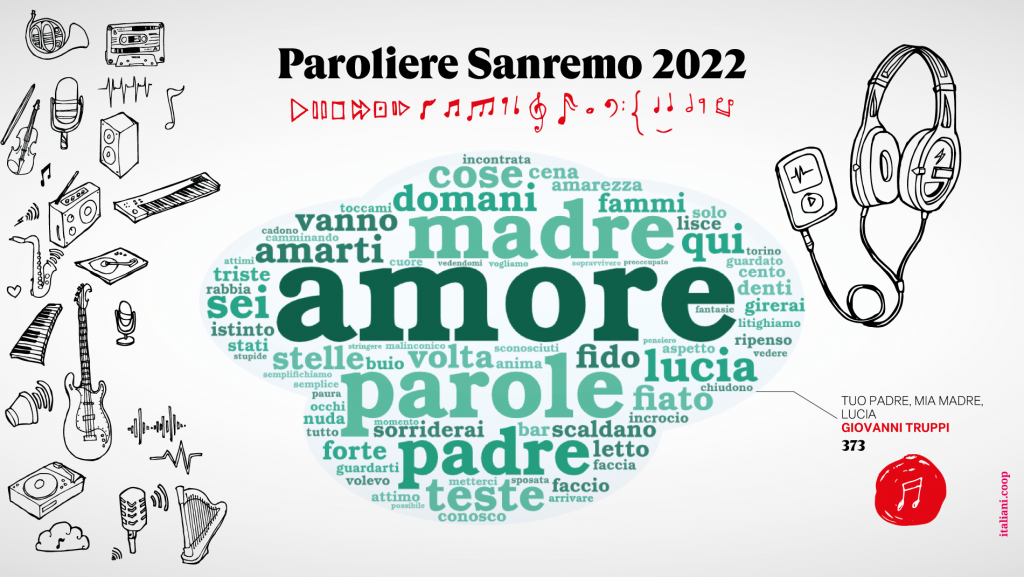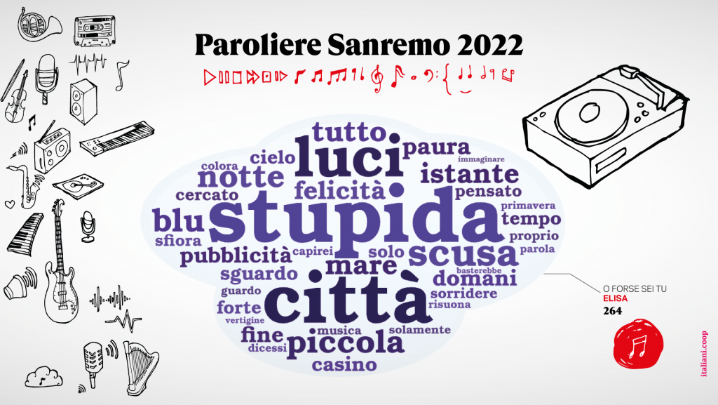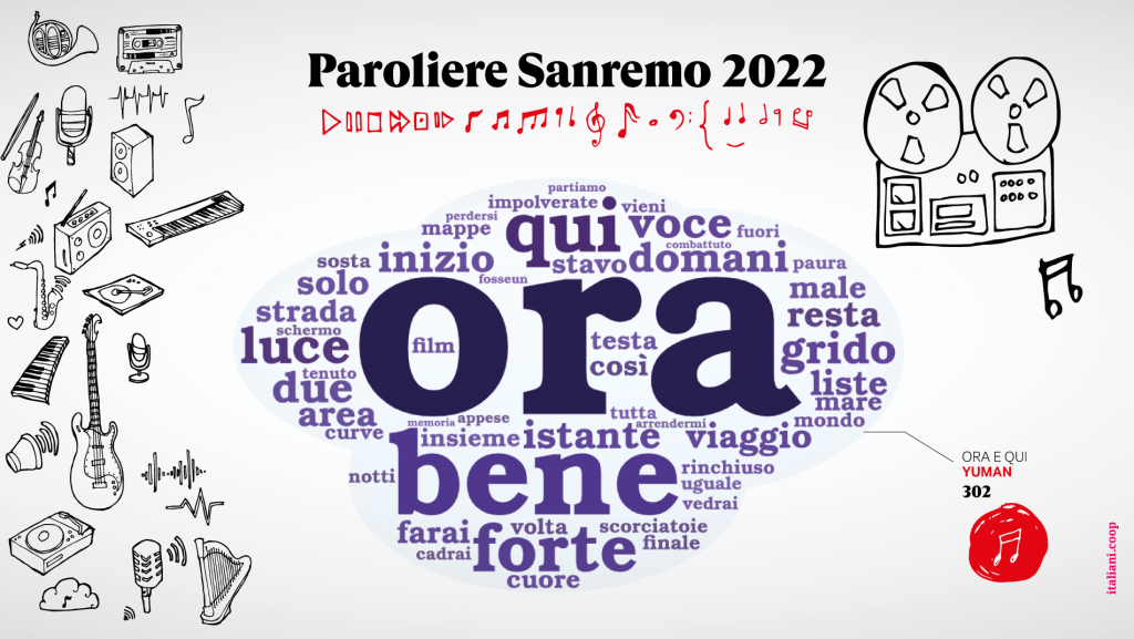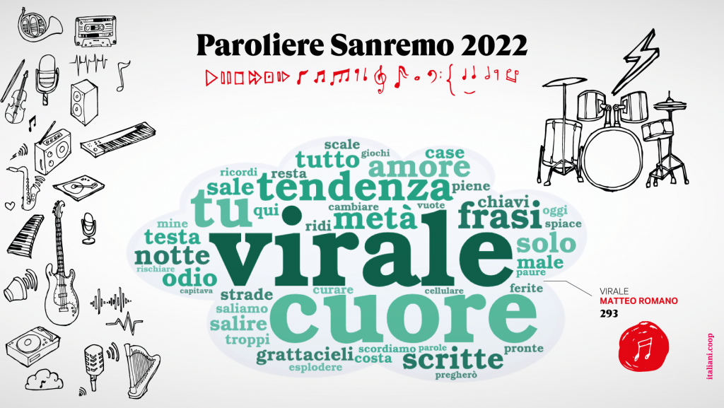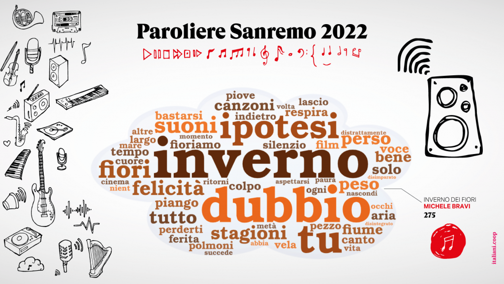 L’amore torna protagonista nei testi delle canzoni in gara per la 72ma edizione del Festival di Sanremo. L’importante è non farsi trarre in inganno dalla nuvola di parole dei 25 testi (uno per ogni cantante in gara ) in cui spicca la parola chimica . E sì, perché la canzone di Ditonellapiaga e Donatella Rettore è comunque un inno all’amore parlando della chimica che attrae due corpi umani. La seconda parola che emerge nella cloud è amore, come nelle migliori tradizioni sanremesi, e poi le più svariate occhi, mani, amarti cuore…Un Festival della canzone italiana meno prolisso anche per il calo del numero dei partecipanti raggruppati in questa edizione in un’unica categoria Artisti. 6876 le parole utilizzate dai concorrenti (meno rispetto alle oltre 10 mila del 2021 e 9975 del 2020, quando però concorrevano rispettivamente 34 e 32 cantanti). Ad aggiudicarsi il premio del più loquace Noemi con 404 parole nella sua Ti amo non lo so dire, palma d’oro invece per la capacità di sintesi ai 137 lemmi di Ovunque sarai di Irama. E anche se l’amore la fa da padrona, non manca la varietà in questa 72ma edizione come dimostrano le cloud delle 25 canzoni che abbiamo realizzato in occasione dell’evento.
