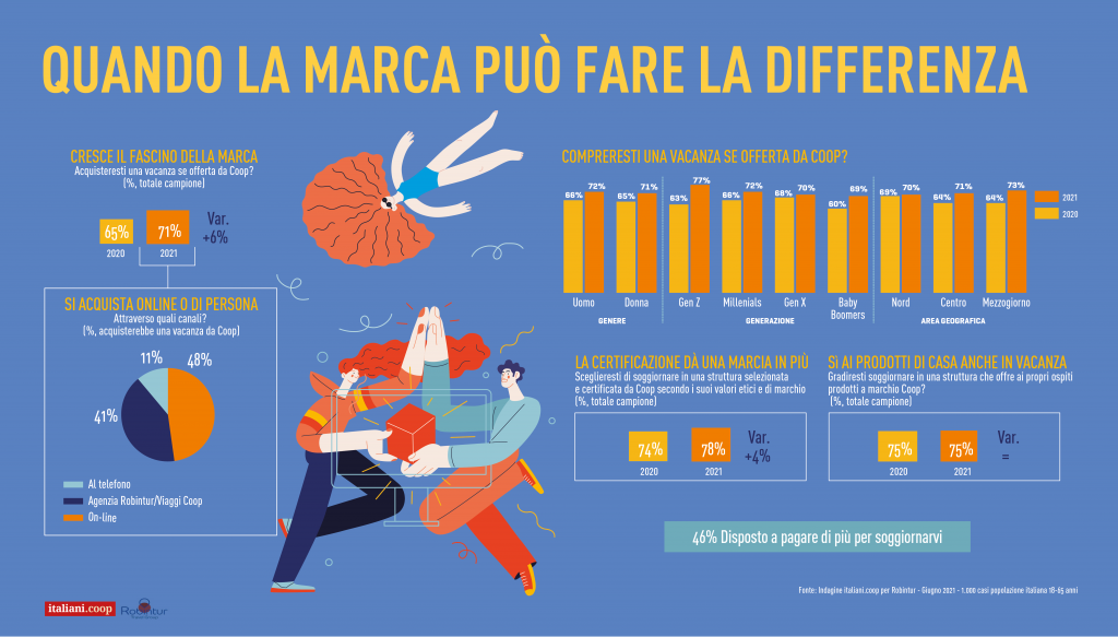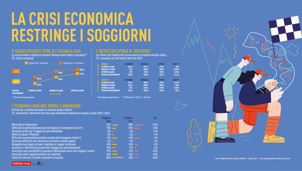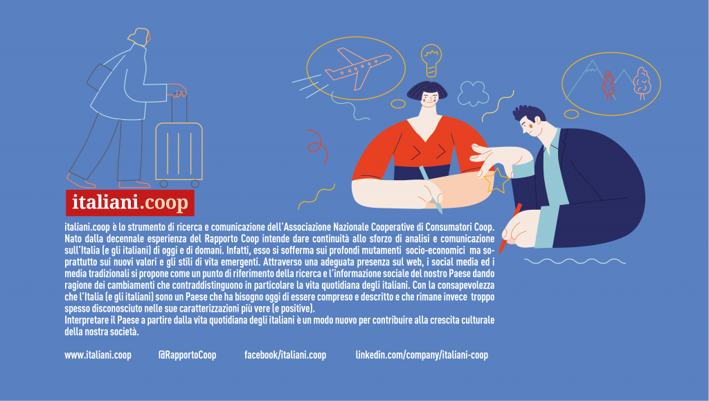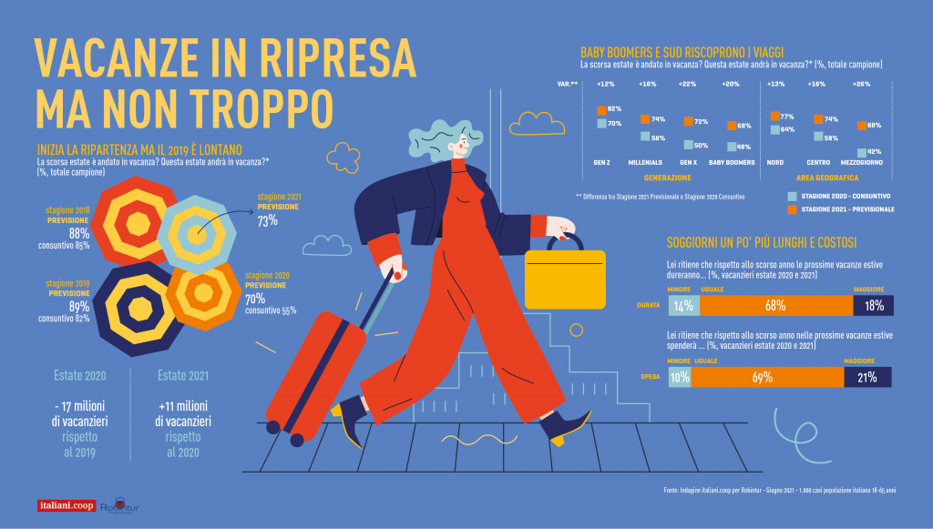 Una ripartenza lenta – Gli italiani tornano a dedicarsi a viaggi e vacanze, anche se i dati del 2019 sono ancora lontani stando alle principali risultanze della survey “Gli italiani e le vacanze della ripartenza” realizzata da italiani.coop (lo strumento di ricerca e analisi di Coop) per Robintur Travel Group. Il 73% dichiara che andrà in vacanza questo anno, un dato in crescita rispetto alle previsioni 2020, quando lo dichiarava il 70% della popolazione, quindi sempre in previsione 11 milioni di italiani in più in viaggio nel 2021 (rispetto al 2020). Ma quell’82% del 2019 è ancora un miraggio e lo dimostrano i dati definitivi dei vacanzieri 2020: lo scorso anno alla fine, malgrado la previsione più alta, solo il 55% degli italiani è andato in vacanza, 17 milioni in meno di coloro che ci sono andati nel 2019. E anche quest’anno a funzionare da disincentivo si riaffaccia la crisi economica che influenza le scelte; infatti, tra le prime motivazioni per cui il 27% del campione dichiara di non partire c’è la necessità di risparmiare (lo afferma il 38% di loro contro il 25% dell’anno scorso). Cala invece in questa stagione il timore di contrarre il Covid, che scende dal 48% dell’anno della pandemia al 19% del 2021, e per converso cresce il timore di non trovare posto, per cui il 58% ha già prenotato o lo farà a breve (in crescita sul 2020 quando era il 52% nello stesso periodo di riferimento).