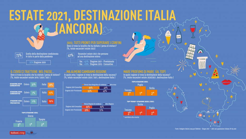 Destinazione Italia (ancora) – Il peso della pandemia si fa ancora sentire sulla destinazione scelta dagli italiani: 9 famiglie su 10 rimarranno nel territorio nazionale e solo l’11% degli intervistati dichiara di scegliere l’estero, pari a circa 4,5 milioni di italiani. Tra le motivazioni che più pesano, la cita il 73%, c’è proprio la pandemia, un dato che non si discosta da quel 75% che giustificava in questo modo la propria permanenza in Italia nel 2020. Per chi, comunque, varca i confini si pensa alla Grecia come prima meta scelta, poi Spagna e Francia. Mentre per chi rimane nel Paese, almeno c’è la determinazione di cambiare regione: 72% (contro il 65% del 2020, quando gli italiani avevano ancora di più ridotto la loro mobilità). Tra le regioni più scelte al primo posto Puglia, poi Sicilia e Toscana, anche se chi cresce di più rispetto al 2020 è la Sicilia, seguita da Toscana e Puglia.