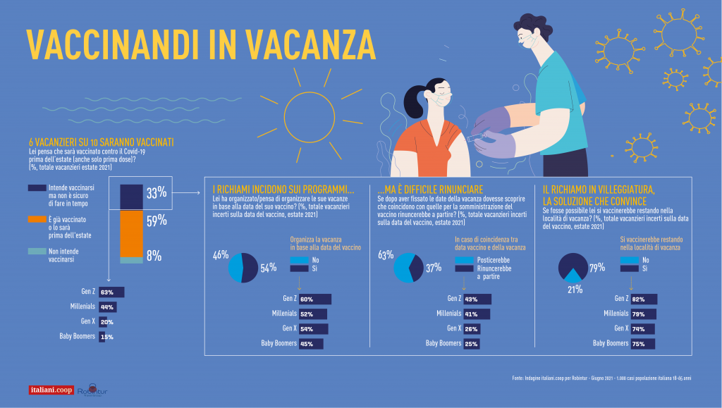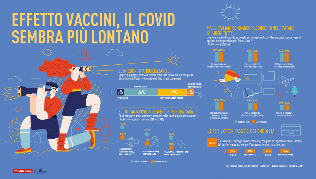 Effetto vaccini – È la campagna di immunizzazione poi a incidere sulle vacanze degli italiani. Quasi uno su due (45%) grazie al vaccino dichiara di avere meno paura dell’anno scorso di contrarre il Covid. Proprio per questo sembra che alcuni lasceranno qualche mascherina e gel disinfettante a casa e magari metteranno in valigia qualche costume in più. Ma sul “liberi tutti” gli italiani sono ancora molto disciplinati e previdenti: 8 su 10 si dicono favorevoli alle mascherine, ai contingentamenti degli ingressi, alle prenotazioni obbligatorie. Dopo mesi di limitazioni anche il green pass raccoglie il favore del 67% degli italiani, con consensi più elevati fra le generazioni più giovani, certo tra le più stanche delle chiusure. E per quel 33% degli italiani che dichiara di volersi vaccinare ma ha paura di non fare in tempo, la soluzione ideale sarebbe la somministrazione del siero in vacanza. Uno su due arriva a organizzare il proprio viaggio in base al vaccino, ma solo il 37% cancellerebbe il richiamo se coincidente con il periodo del soggiorno, mentre il 79% vorrebbe poter realizzare il richiamo direttamente nella località di villeggiatura.