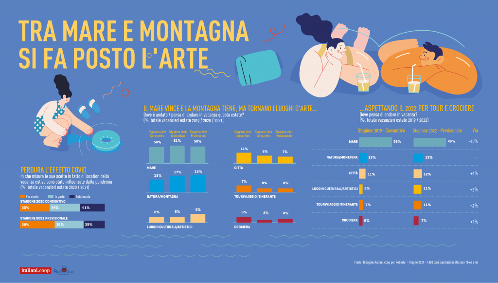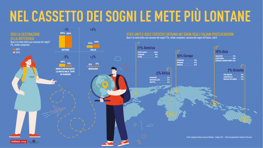 Mare, città d’arte e alberghi – La spiaggia rimane la meta del cuore anche nell’estate 2021, scelta dal 58% dei vacanzieri. Tiene la montagna riscoperta forse anche grazie alla pandemia nel 2020 e tornano a crescere le città d’arte, che lo scorso anno avevano forse pagato l’immaginario collettivo di essere luoghi affollati. Per chi parte e ha già prenotato si tornano a scegliere le sistemazioni comode come quelle alberghiere e a lasciare da parte le case vacanza o di proprietà, che invece nel 2020 avevano offerto un’idea di sicurezza sanitaria. E se per crociere e tour si rimanda al 2022, il lockdown sposta fuori continente i sogni degli italiani e la vacanza dei desideri, ancora chiusa nel cassetto è quella verso le Americhe (USA, Caraibi, Cuba) o l’Asia (Maldive, Giappone ed Emirati Arabi Uniti).