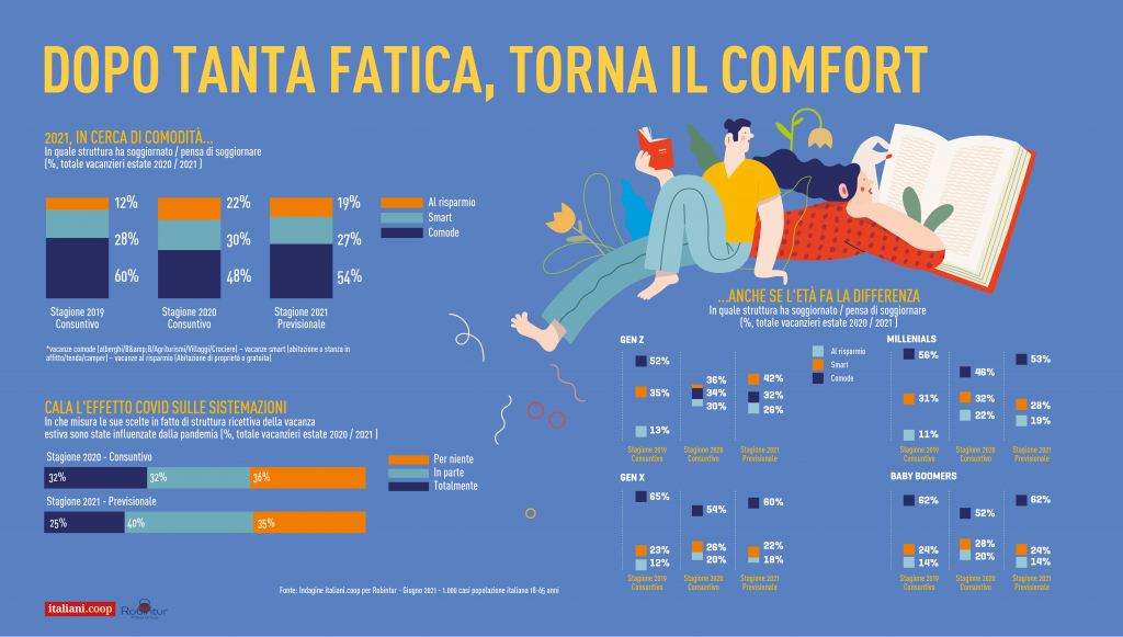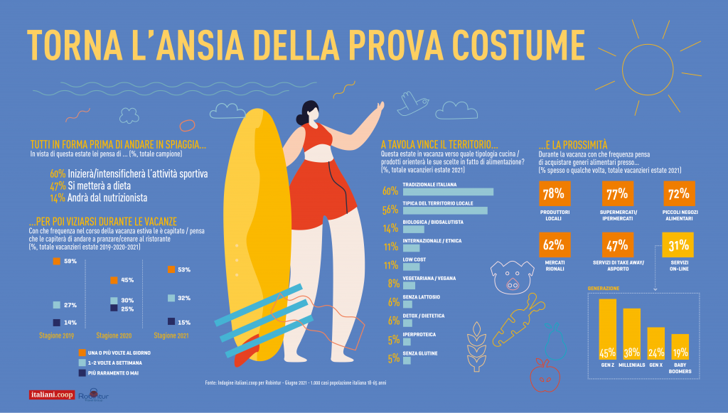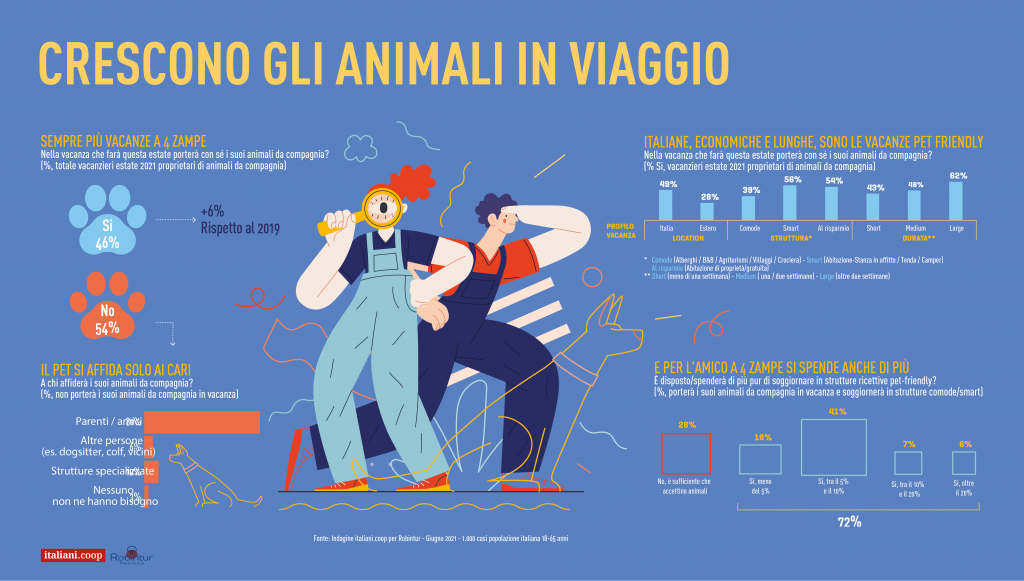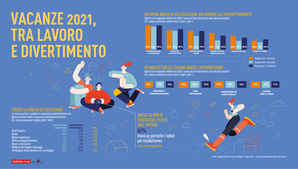 Vacanze disciplinate con qualche retrogusto di lockdown – Qualche traccia della pandemia si ritrova anche nelle motivazioni e nelle attività degli italiani in villeggiatura. Il divertimento sale del 4% rispetto al 2020, il relax del 2%, mentre scende di tre punti percentuali la compagnia delle persone con cui si viaggia, forse sintomo della perduta abitudine alla collettività. Oltretutto lo smart working viene in vacanza, giacché il 62% dei villeggianti userà pc o tablet per studio e lavoro. Si torna a pranzare e cenare al ristorante, si va a mostre e musei, si torna a ballare (per quanto sarà possibile) e anche al cinema. E anche un’altra abitudine dei giorni del lockdown viene in vacanza con noi: l’idea di prendersi cura della propria salute fisica e mentale. I vacanzieri pensano di fare più sport degli anni precedenti, di partecipare di più a funzioni religiose, meditare, passeggiare in luoghi isolati e leggere. Nel panico della prova costume oltretutto gli italiani sin da adesso prevedono di intensificare l’attività sportiva o di mettersi a dieta o andare dal nutrizionista. Il lockdown ci ha fatto riscoprire sapori che portiamo anche in vacanza come quelli della tradizione italiana e i prodotti tipici dei territori ospitanti, comprati possibilmente da produttori locali, piccoli negozi alimentari, i supermercati della città o anche i mercati rionali. E sempre dalle chiusure dello scorso anno, ci portiamo dietro con più frequenza rispetto al passato gli amici a quattro zampe che ci hanno fatto compagnia nei periodi peggiori.