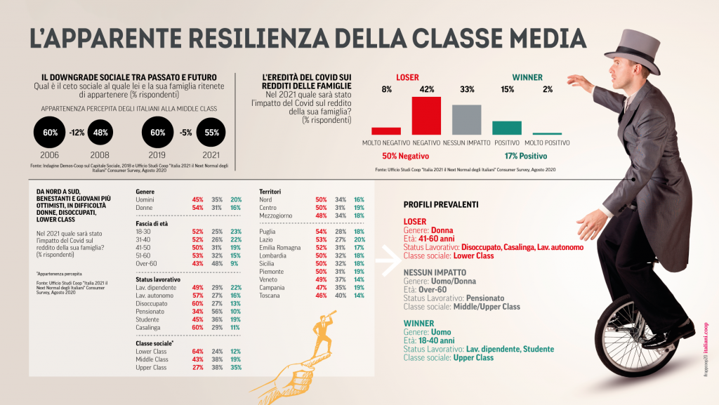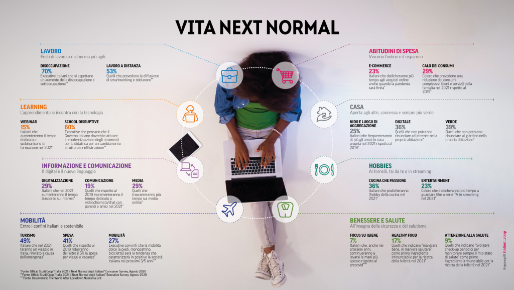 I nuovi stili di vita degli italiani- In attesa che il Recovery Fund si concretizzi e benchè confortati dagli ammortizzatori sociali già messi in campo dal Governo, gli italiani si rivelano essere ancora oggi i più pessimisti d’Europa e in effetti insieme agli spagnoli registrano il più ampio peggioramento delle proprie condizioni di vita rispetto al 2019 (e non sembra andare meglio se le ultime previsioni confermano un recupero nel 2021 solo della metà dei posti di lavoro che perderemo nel 2020). Contemporaneamente però nel nostro Paese “solo” il 5% delle famiglie fino ad ora afferenti alla classe media prevede di scivolare nelle classi più basse nei prossimi anni: un dato comunque drammatico ma inferiore a quel 12% che ha subito analoga sorte durante la crisi economica globale del 2006/2008. D’altro canto il 38% pensa di dover far fronte nel 2021 a seri problemi economici e tra questi il 60% teme di dover intaccare i propri risparmi o di essere costretto a chiedere un aiuto economico a Governo, amici/parenti e banche. A farne le spese sono soprattutto le classi più fragili, i giovani, le donne, mentre c’è un 17% di italiani che prevede nel 2021 un miglioramento delle proprie condizioni economiche (si tratta prevalentemente di uomini dell’upper class).