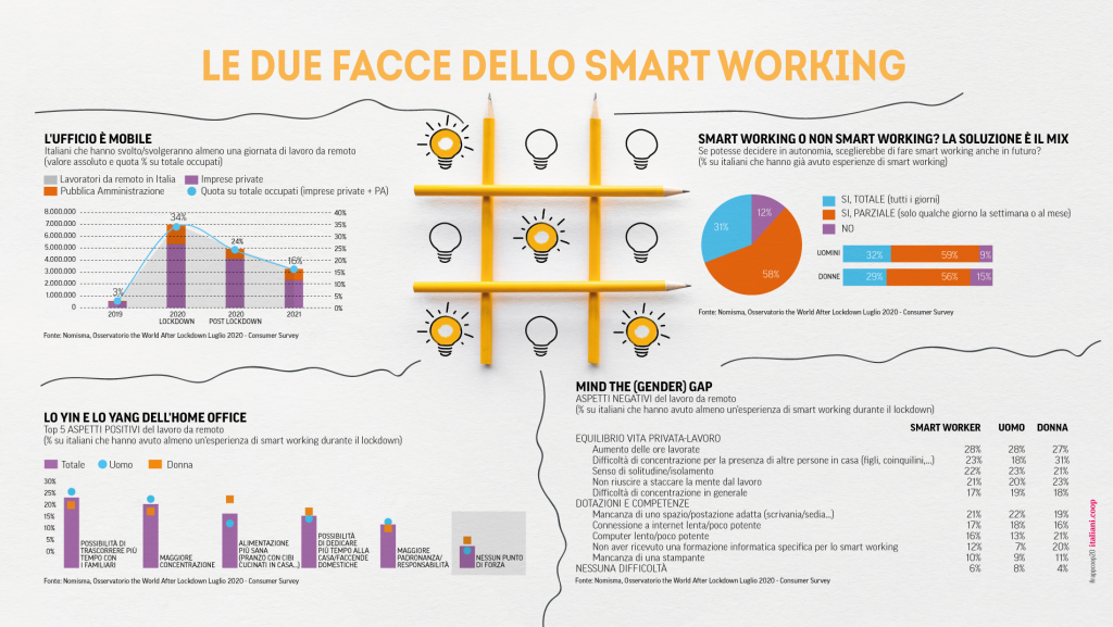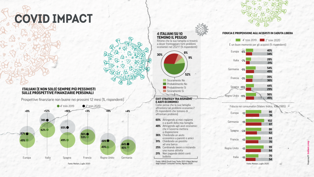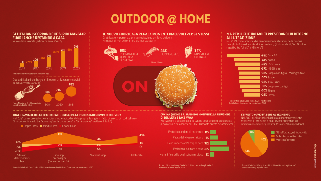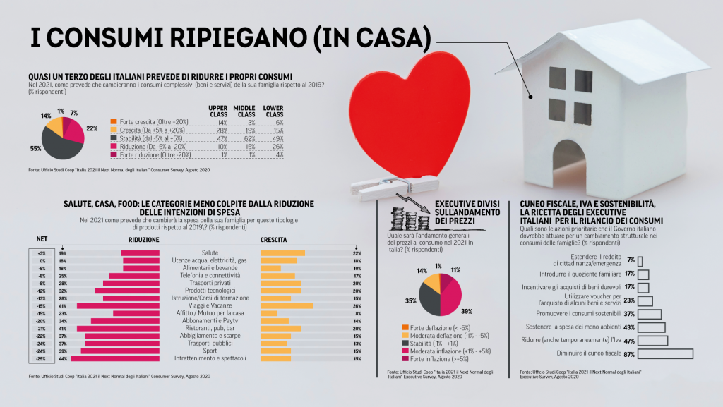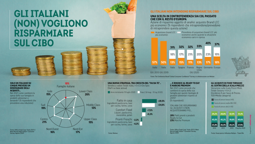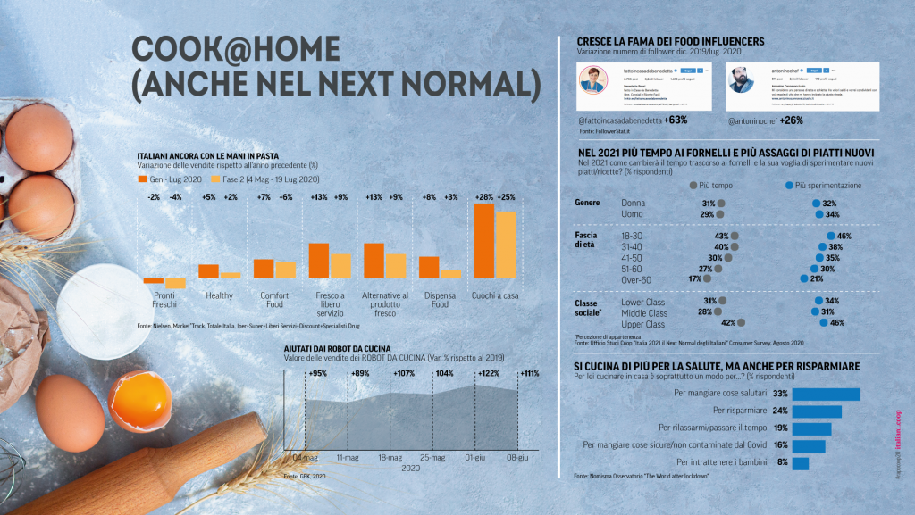 Homemade, digital, safe e sostenibile il nuovo cibo degli italiani – La casa come salvagente a cui tenersi stretti fa il paio con un’altra costante che distingue ancora nel postcovid gli italiani dai cugini europei: il cibo. Alla spesa alimentare, pur nell’emergenza e in una evidente contrazione generalizzata degli acquisti, gli italiani non rinunciano e solo il 31% dichiara di voler acquistare prodotti di largo consumo confezionato più economici a fronte di un 37% della media europea; un dato decisamente inferiore al 50% registrato lo scorso anno e al 57% del 2013 (anno in cui eravamo in piena crisi economica con un Pil a -1,8%). E anche a emergenza sanitaria finita solo il 18% dice di voler acquistare prodotti più economici. Guardando dentro al carrello si nota una straordinaria inversione di tendenza rispetto alla fotografia scattata appena un anno fa dal RapportoCoop2019. Allora era fuga dai fornelli, un fenomeno che in realtà continuava in progressione costante tanto da dimezzare in 20 anni il tempo passato a cucinare ogni giorno ridotto allora a appena 37 minuti. Complice il lockdown invece gli italiani hanno rimesso le mani in pasta e anche nel postcovid il cook@home è una costante che spiega la forte crescita nelle vendite degli ingredienti base (+28.5% in GDO su base annua) a fronte della contrazione dei piatti pronti (-2,2%). Supportati o meno da aiuti tecnologici (la vendita dei robot da cucina ha fatto registrare a giugno +111% rispetto all’anno prima), il 30% dedicherà ancora più tempo alla preparazione del cibo e il 33% sperimenterà di più. 1 su 3 lo farà per “mangiare cose salutari”, ma c’è anche un 16% che lo ritiene un modo per mettersi al riparo da possibili occasioni di contagio. La preparazione domestica dei cibi è probabilmente anche la nuova strategia degli italiani per non rinunciare alla qualità e contemporaneamente alleggerire il proprio budget familiare.