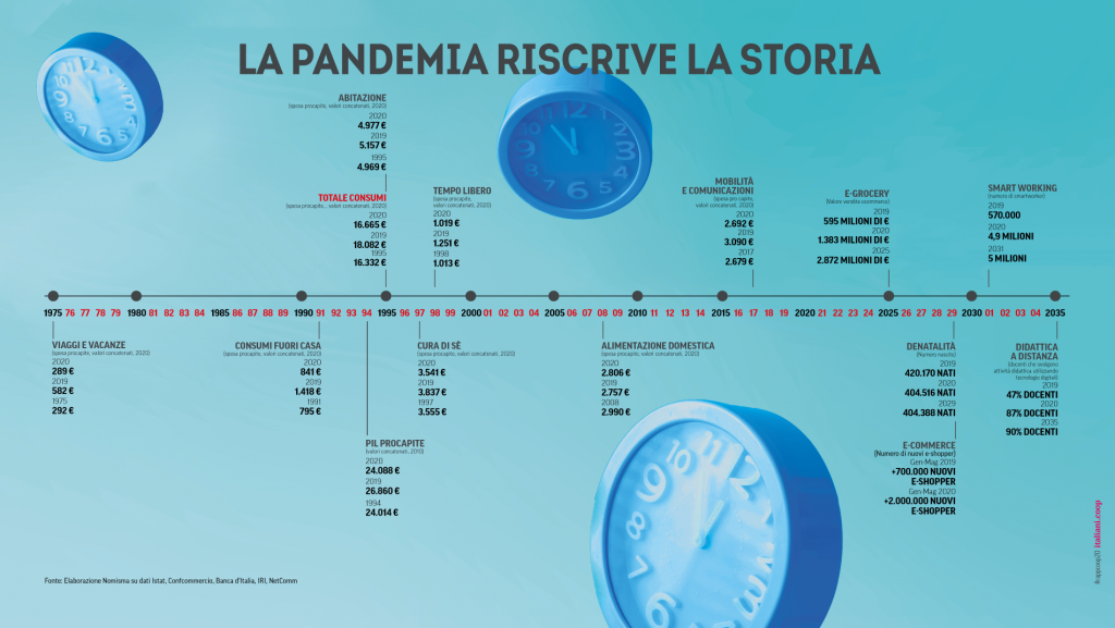 Il Covid ha avuto inoltre anche l’effetto di una macchina del tempo sugli stili di vita degli italiani, trasportandoli avanti e indietro con estrema rapidità rispetto agli andamenti temporali abituali. Da un lato compare così l’Italia delle rinunce con l’arretramento del Pil procapite ritornato ai livelli di metà anni ’90 e la spesa in viaggi trascinata indietro di 45 anni ai livelli del 1975 o i consumi fuori casa arretrati di tre decenni, dall’altra c’è invece l’Italia che balza in avanti velocizzando dinamiche già in essere, ma mai così veloci. E’ questa l’Italia dello smartworking (+770% rispetto a un anno fa), dell’egrocery (+132%), della digitalizzazione a tappe forzate non solo nella sfera privata ma finalmente anche nelle attività professionali (lavoro appunto ma anche didattica, servizi, sanità) che genera una crescita stimata di questo segmento di mercato pari a circa 3 miliardi tra 2020 e 2021. Girando la sfera compare però anche un Paese dove si potrebbe arrivare nel 2021 a perdere 30.000 nascite scendendo così sotto la soglia psicologica dei 400.000 nati in un anno e anticipando di quasi un decennio il ritmo della denatalità. A rinunciare all’idea pianificata di avere un figlio a causa dell’emergenza sanitaria è il 36% dei nostri giovani (18/34 anni) a fronte ad esempio di un 17% dei francesi e addirittura di un 14% dei tedeschi. Non è la sola rinuncia importante: matrimoni, trasferimenti, acquisti di case e aperture di nuove attività figurano tra i progetti rinviati o cancellati e queste scelte di vita mancate hanno coinvolto in totale l’84% di italiani. Le disuguaglianze economiche viaggiano poi di pari passo con i disagi psichici e sociali a svantaggio delle fasce deboli: i ragazzi iperconnessi per i quali è maggiore il rischio hikikomori salgono nei primi sei mesi dell’anno di un +250% fino a toccare quota 1 milione, +119% le chiamate al numero antiviolenza di genere da marzo a giugno. Per curare le ferite ci vorrà tempo: un 36% degli executive italiani si aspetta nei prossimi 3/5 anni una società più rancorosa e violenta.