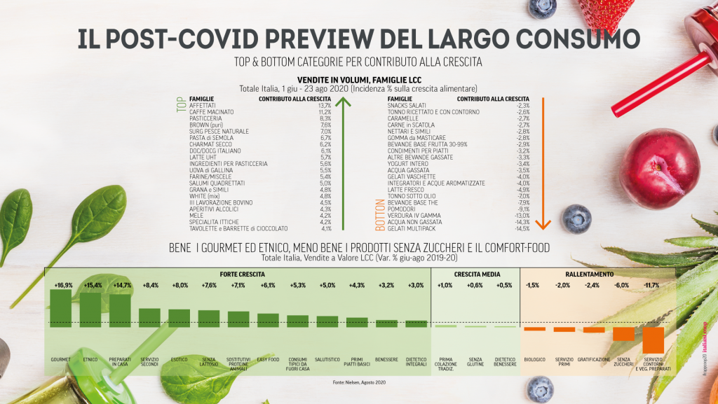 Nella bolla si accorcia anche la filiera del cibo e per un italiano su 2 l’italianità e la provenienza dal proprio territorio acquistano ancora più importanza di quanta ne avessero in periodo precovid dove già godevano di ampia popolarità. E sempre per questioni di sicurezza nell’estate appena trascorsa abbiamo assistito a una vera e propria rivincita del food confezionato che cresce ad un ritmo più che doppio rispetto all’intero comparto alimentare se paragonato a un anno fa: +2,3% contro +0,5% (giugno-metà agosto 2020). Il packaging protettivo e avvolgente sembra in questo caso fare la differenza in tutti i comparti: l’ortofrutta e persino i salumi e latticini. Mentre guardando i carrelli sempre nell’estate riacquista forza il gourmet (+16.9%), l’etnico (+15,4%) e il vegan (+6,9%).