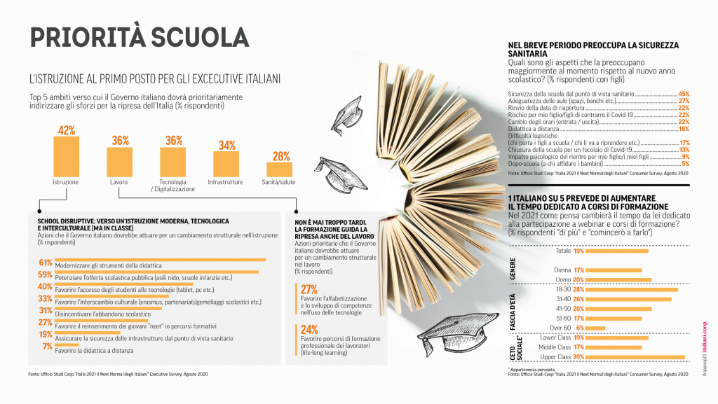 A livello mondiale tutto lascia prevedere uno spostamento ad Oriente del baricentro economico e geopolitico del mondo (la Cina, la Russia e le altre economie asiatiche rispettivamente per il 71%, 42% e 40% della business community italiana vedranno rafforzato il proprio ruolo a livello mondiale) mentre le economie atlantiche sembrano destinate a perdere la loro centralità (il 44% degli executive italiani si attende un indebolimento del ruolo geopolitico e economico degli Usa e il 78 di quello europeo). Contemporaneamente però in maniera un po’ inattesa il Covid si è rivelato un formidabile agente aggregatore dei 27 Paesi membri dell’Ue, ha sancito la fine dell’austerity e avviato un piano di rilancio di ingenti proporzioni di cui l’Italia godrà in larga parte. Non a caso l’87% dei top manager intervistati nella survey “Italia 2021, il Next Normal degli italiani” dichiara imprescindibile l’appartenenza alla Ue per superare la fase attuale. E il 42% indica come ambiti prioritari a cui destinare le risorse europee il potenziamento dell’istruzione, seguono gli investimenti sul capitale umano (lavoro per il 36%, tecnologia e digitalizzazione a pari merito e quindi infrastrutture e sanità/salute).