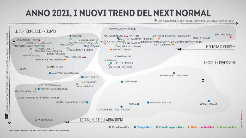Per tanti italiani la pandemia (e le difficoltà economiche) faranno ancora della casa il luogo privilegiato della quotidianità del prossimo anno. Per tanti altri, invece, torneranno a crescere i viaggi e le occasioni di intrattenimento outdoor; oltre 4 italiani su 10 dichiarano che nei prossimi 12 mesi viaggeranno più spesso. Molti hanno intenzione di tornare alla socialità live (musei, cinema) e esprimono voglia di compresenza fisica non più solo virtuale. Più di uno su 3 agogna a serate in compagnia. Diventano invece fuori moda i comportamenti orientati al riconoscimento sociale (per un italiano su due si riduce l’acquisto di abiti di alta moda), le visite ai grandi mall e le discoteche (il 63% degli italiani rinuncerà a quest’ultime in parte o del tutto).