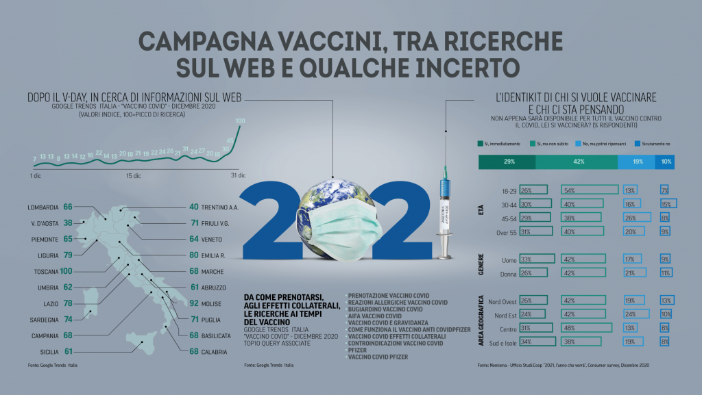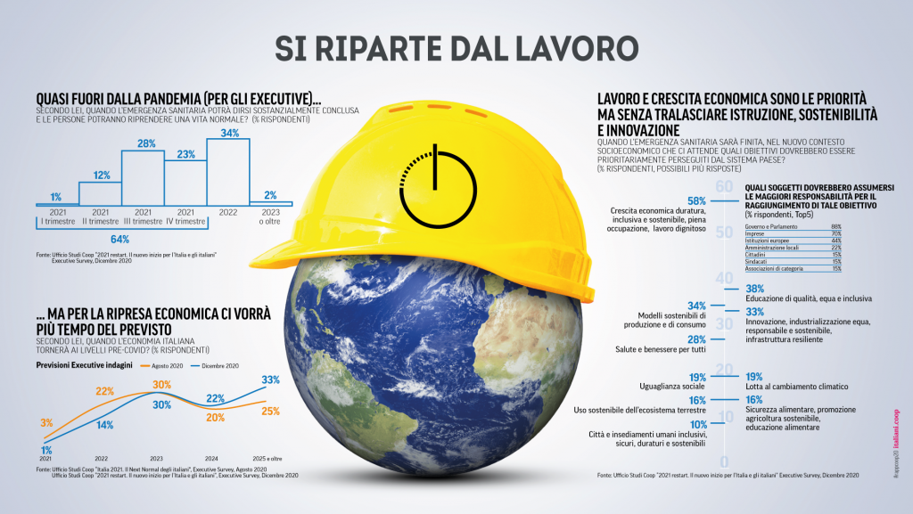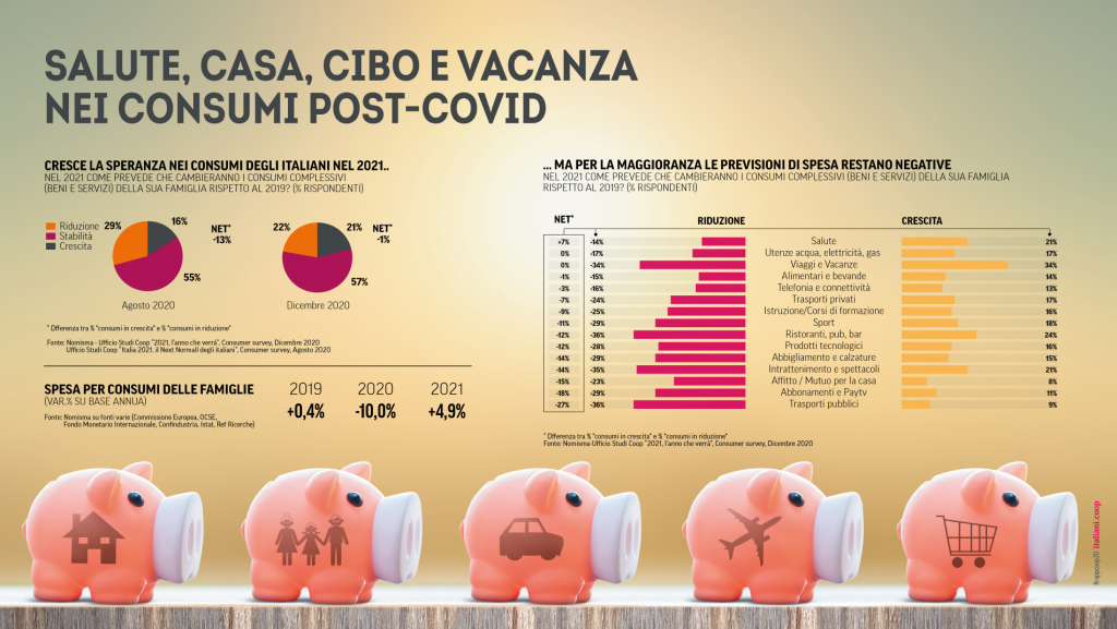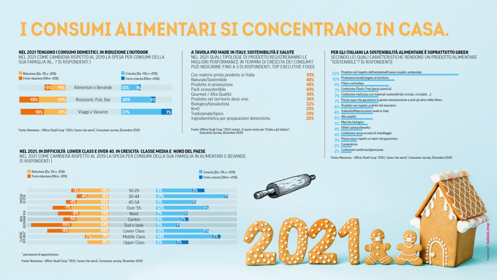 *Le previsioni 2021 sono frutto di due indagini condotte nel mese di dicembre 2020 dall’Ufficio studi Coop e i suoi partner. La prima, in collaborazione Coop-Nomisma, “2021, l’anno che verrà” realizzata con metodo Cawi ha coinvolto un campione di 800 individui rappresentativo della popolazione 18-65 anni. La seconda “2021 Restart. Il nuovo inizio per l’Italia e gli italiani” si è rivolta alla community del sito di italiani.coop ed ha coinvolto 700 opinion leader e market maker fruitori delle passate edizioni del Rapporto. Tra questi sono stati selezionati 280 soggetti con profilo manageriale/executive (imprenditori, amministratori delegati e direttori, liberi professionisti) in grado di anticipare più di altri le tendenze future del Paese. A tutti va il nostro ringraziamento.