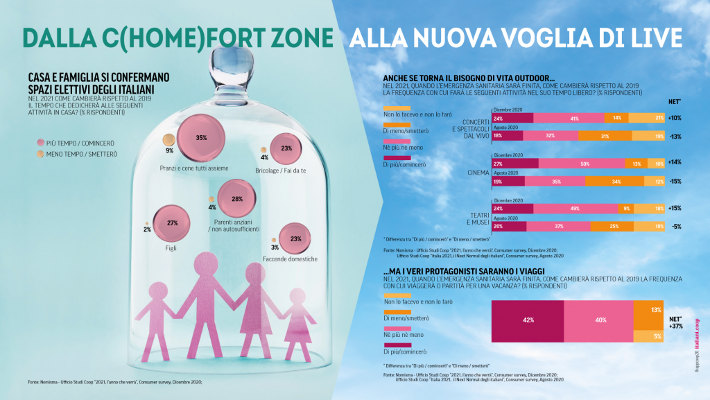 Stando alla fotografia scattata con il sondaggio “2021, l’anno che verrà” svolto in collaborazione Coop-Nomisma e nell’indagine “2021 Restart. Il nuovo inizio per l’Italia e gli italiani” rivolta alla community del sito di italiani.coop*, la “bolla” in cui gli italiani si sono chiusi facendo di necessità virtù è prossima all’esplosione e fra le voci di spesa in crescita, in un 2021 che non potrà comunque riguadagnare i livelli e la composizione della spesa pre-Covid (la stima si attesta su un +4,9%), tornano prepotentemente i viaggi e le vacanze, la socialità live e una nuova mobilità (sostenibile e Covid free).