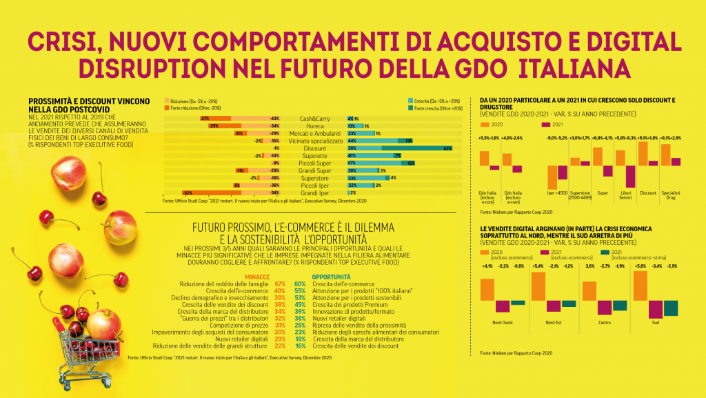 Anche nello scenario 2021, i punti più critici, stando ai manager della filiera alimentare sono, soprattutto la minaccia della crisi economica e dei suoi effetti negativi sulla domanda finale (il 27% prevede un calo negli acquisti di prodotti alimentari o del largo consumo) e nel 2021, con il graduale esaurirsi della emergenza sanitaria si attende una flessione del fatturato della rete fisica della grande distribuzione del 2,6% (-1,6% se si considera anche l’e-commerce). Andamento in controtendenza nella rete fisica solo per discount (+1,8%), specialisti drug (+2,9%). In maggiore difficoltà certamente il Sud, mentre sarà meno pronunciata la perdita delle regioni settentrionali anche grazie alla forte ulteriore crescita dell’e-commerce che si concentra proprio in quei territori.