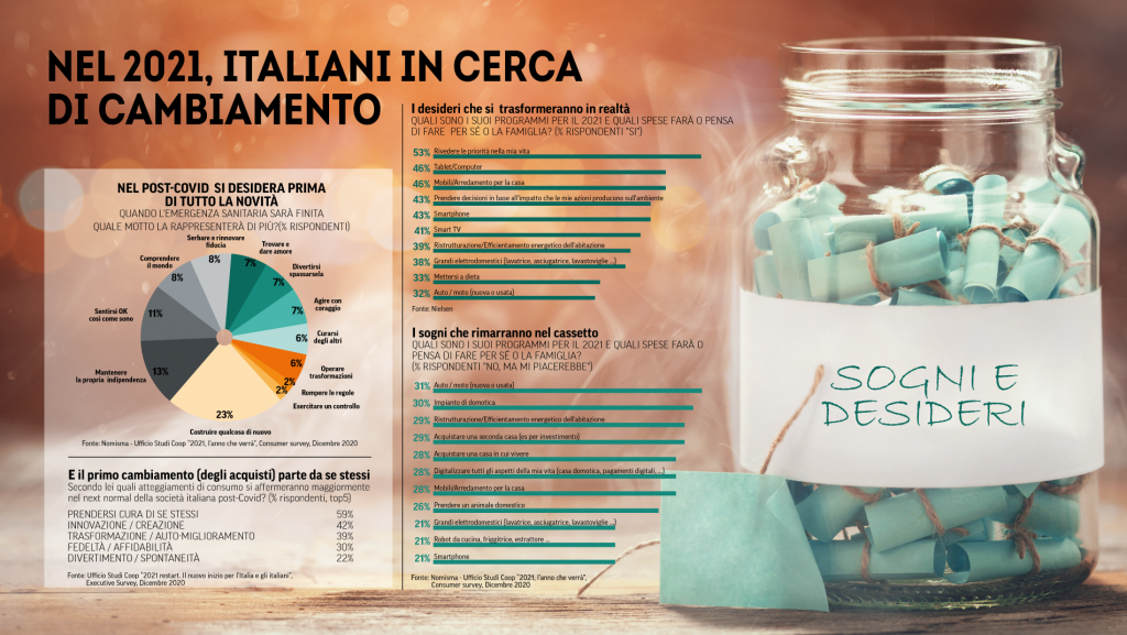Per il 37% del campione la “speranza” torna prepotentemente ad essere la parola che meglio può descrivere il 2021, subito seguita dal “cambiamento” (19%) e dalla possibilità di poter presto costruire “qualcosa di nuovo”. E’ questo il motto che sembra maggiormente rappresentare gli italiani nel futuro senza virus (lo afferma il 23% degli intervistati). D’altronde più della metà (il 53%) ammette di voler rivedere le priorità della propria esistenza. Già da tempo lontani dai cliché che li vogliono ancora conformisti e abitudinari, gli italiani di oggi sembrano voler ulteriormente accelerare quella metamorfosi che li contraddistingue da alcuni anni e che trova rispondenza nel sondaggio “2021, l’anno che verrà” svolto in collaborazione Coop-Nomisma su un campione rappresentativo della popolazione italiana e nell’indagine “2021 Restart. Il nuovo inizio per l’Italia e gli italiani” rivolta ai manager appartenenti alla community di italiani.coop*.