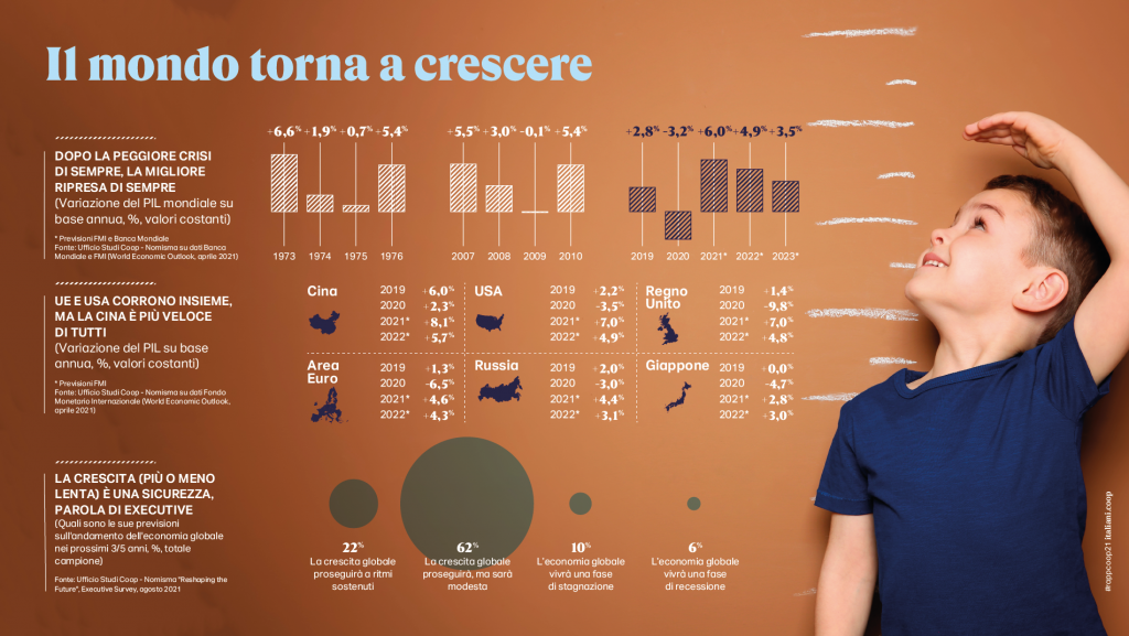 Un mondo multipolare, una obbligata rivoluzione verde – Dopo la peggiore crisi di tutti i tempi, la migliore ripresa di sempre. Le variazioni del Pil mondiale tutte al rialzo si attestano su un +6% nel 2021 ma continuano in positivo anche negli anni a venire (+4,9% nel 2022 e +3,5% nel 2023). Corre più veloce di tutti la Cina in un mondo multipolare in cui gli Usa sembrano abdicare al loro storico ruolo di potenza egemone e offrono anche all’Europa la chance di diventare soggetto stabilizzatore nella costruzione dei nuovi equilibri geopolitici tra i molti protagonisti regionali emergenti.