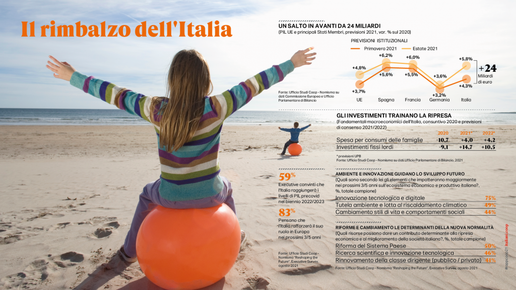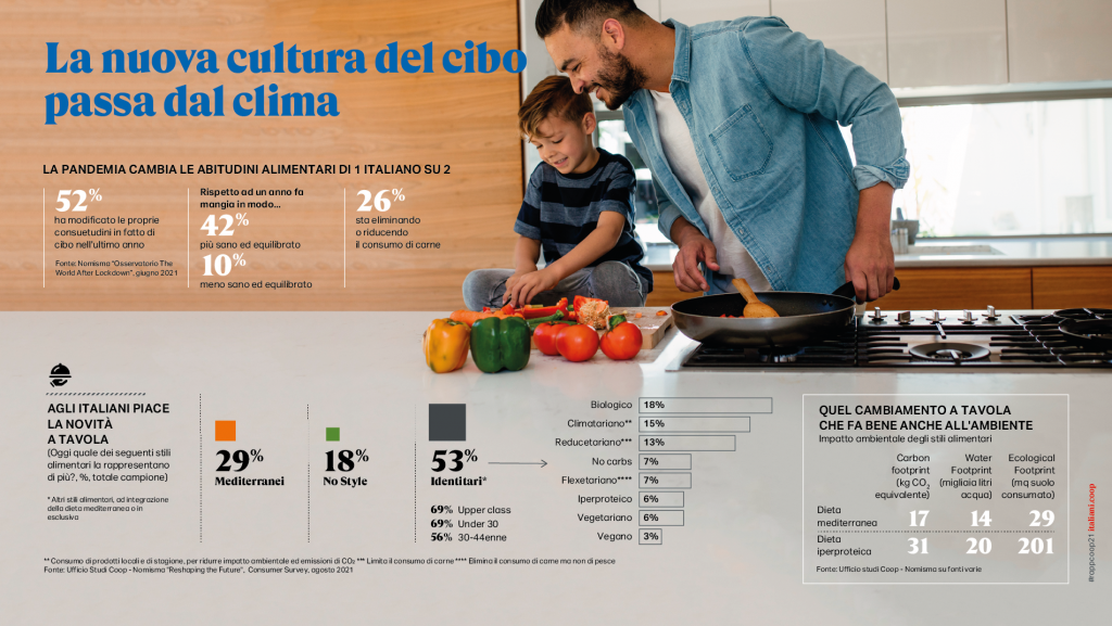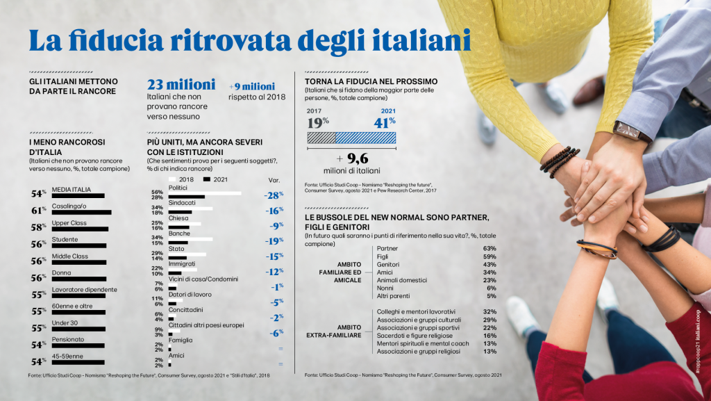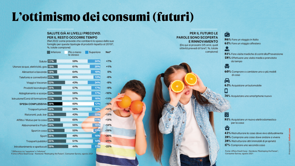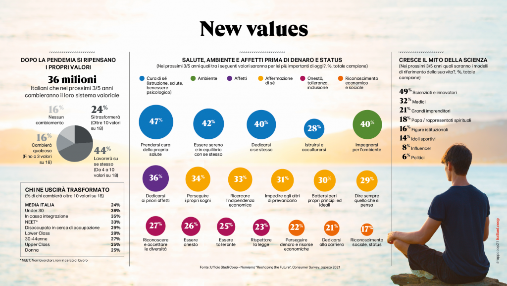 Presentata l’anteprima digitale del “Rapporto Coop 2021 – Economia, Consumi e stili di vita degli italiani di oggi e di domani” redatto dall’Ufficio Studi di Ancc-Coop (Associazione Nazionale Cooperative di Consumatori) con la collaborazione scientifica di Nomisma, il supporto di analisi di Nielsen e i contributi originali di Gfk, Gs1-Osservatorio Immagino, Iri Information Resources, Mediobanca Ufficio Studi, Npd, Crif, Tetra Pak Italia. L’edizione 2021 del Rapporto è tutta orientata a descrivere la situazione della nuova realtà post Covid e per fare questo, oltre alle fonti di solito utilizzate, si è avvalsa di due diverse survey intitolate “Reshaping the future” e condotte entrambe nello scorso mese di agosto. La prima ha coinvolto un campione di 1.500 italiani rappresentativo della popolazione over 18 (18-75 anni). La seconda si è rivolta ad un panel della community del sito di italiani.coop e ha coinvolto 1.000 opinion leader e market maker fruitori delle passate edizioni del Rapporto. Tra questi sono stati selezionati 470 ruoli apicali (imprenditori, amministratori delegati e direttori, liberi professionisti) in grado di anticipare più di altri le tendenze future del Paese. A tutti va il nostro ringraziamento.