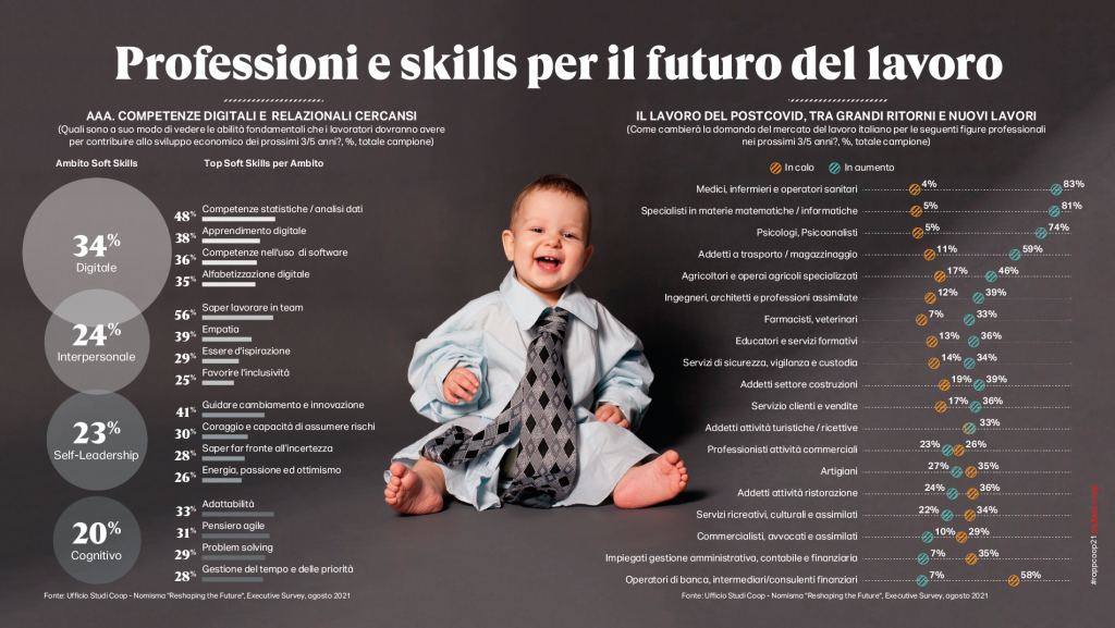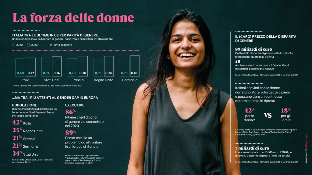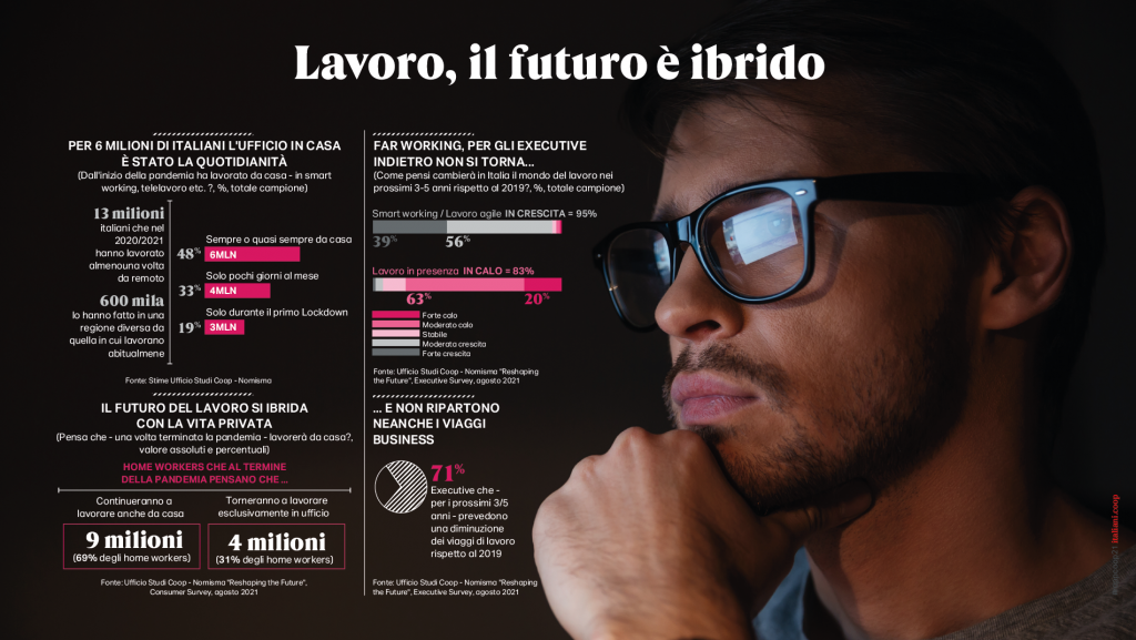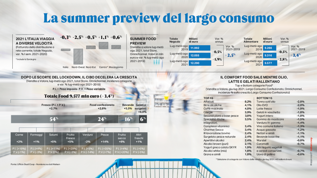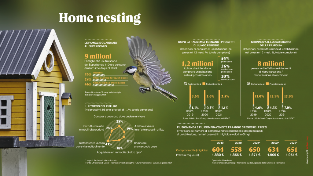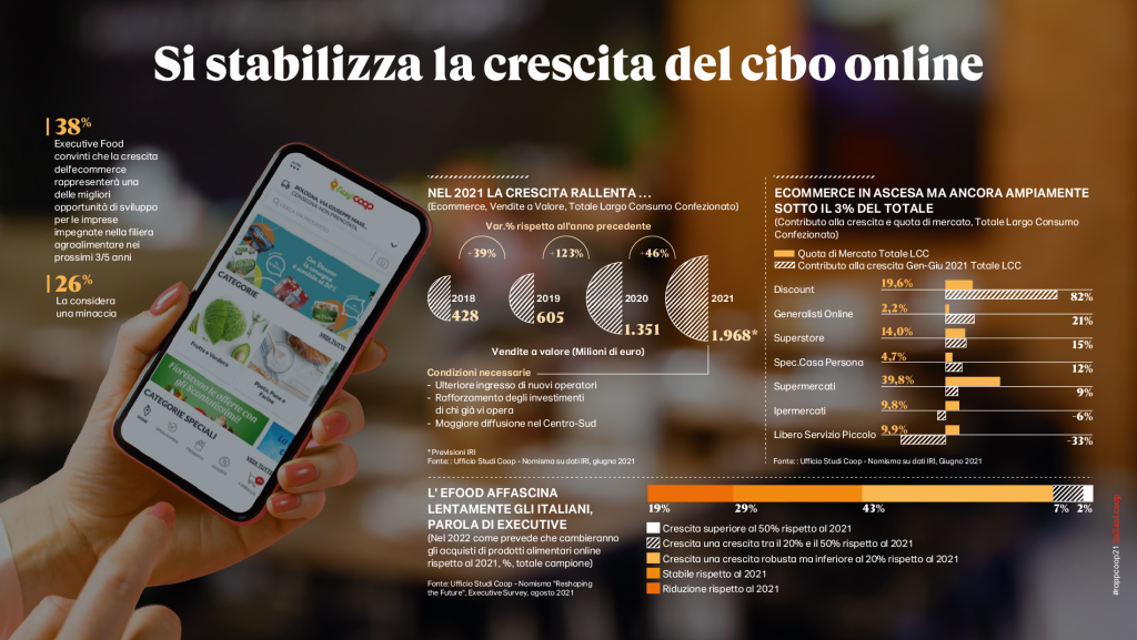 Presentata l’anteprima digitale del “Rapporto Coop 2021 – Economia, Consumi e stili di vita degli italiani di oggi e di domani” redatto dall’Ufficio Studi di Ancc-Coop (Associazione Nazionale Cooperative di Consumatori) con la collaborazione scientifica di Nomisma, il supporto di analisi di Nielsen e i contributi originali di Gfk, Gs1-Osservatorio Immagino, Iri Information Resources, Mediobanca Ufficio Studi, Npd, Crif, Tetra Pak Italia. L’edizione 2021 del Rapporto è tutta orientata a descrivere la situazione della nuova realtà post Covid e per fare questo, oltre alle fonti di solito utilizzate, si è avvalsa di due diverse survey intitolate “Reshaping the future” e condotte entrambe nello scorso mese di agosto. La prima ha coinvolto un campione di 1.500 italiani rappresentativo della popolazione over 18 (18-75 anni). La seconda si è rivolta ad un panel della community del sito di italiani.coop e ha coinvolto 1.000 opinion leader e market maker fruitori delle passate edizioni del Rapporto. Tra questi sono stati selezionati 470 ruoli apicali (imprenditori, amministratori delegati e direttori, liberi professionisti) in grado di anticipare più di altri le tendenze future del Paese. A tutti va il nostro ringraziamento.