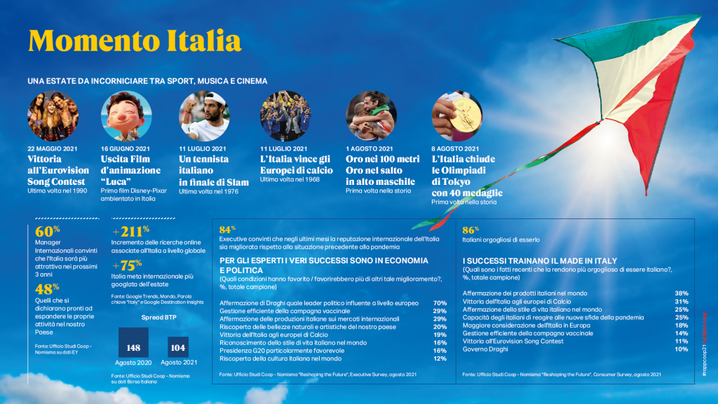 In Europa e nel mondo, l’Italia vive una seconda giovinezza; cresce più in fretta delle aspettative (il balzo in avanti del Pil potrebbe sfiorare il 6%), trascinata dall’export che ha già superato i livelli pre Covid e dalla riconversione digitale della propria manifattura. Gode, soprattutto, di un nuovo e inatteso momento di favore internazionale grazie ai recenti, molteplici successi sportivi e musicali, ma anche alla buona gestione della pandemia e soprattutto all’effetto autorevolezza generato dalla premiership di Mario Draghi. Durante gli Europei di calcio le ricerche on line associate alla parola “Italia” sono cresciute di un +211% e l’Italia resta in testa alle wish destination mondiali. Soprattutto, il 60% della business community internazionale si dichiara convinto di una maggiore attrattività del Paese nei prossimi 3 anni e il 48% lo ritiene una possibile destinazione dei propri investimenti futuri. Anche per questi nuovi riconoscimenti, l’86% degli intervistati si dichiara orgoglioso di essere italiano. E cresce anche la fiducia degli italiani nell’Europa e nell’Ue (oggi al 44% tra i valori più bassi nell’Ue ma il più alto fra gli italiani da marzo 2011, quindi negli ultimi 10 anni).
