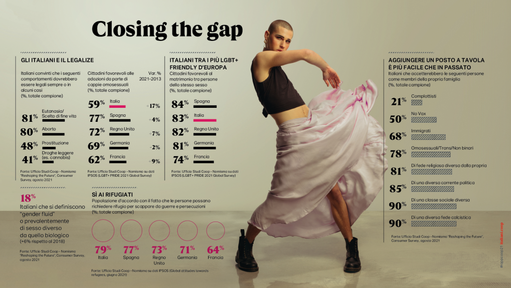 Le inquietudini del presente e la nuova forma del futuro- “Io penso positivo” è comunque il nuovo mood post pandemia per quasi 7 italiani su 10 e, messo da parte il rancore, torna la fiducia nel prossimo (lo afferma il 41% rispetto al 19% di quattro anni fa), a partire dalla famiglia e dagli affetti più stretti. Nel rinnovato clima di benevolenza vengono assorbite con più elasticità anche le differenze. Così i nostri connazionali si definiscono pro eutanasia e aborto, accoglienti con i rifugiati e tra i più LGBT+ friendly del continente. E pur posizionandosi tra gli ultimi Paesi in Europa quanto a parità di genere, il 42% degli italiani mostra consapevolezza di questo triste primato. Sono proprio le donne ad essere le più convinte delle proprie capacità (già oggi sono più istruite degli uomini) e ritengono di essere la prima potenzialità inespressa di cui dovrebbe approfittare il Paese per il suo rilancio (tra gli italiani lo sostiene il 42% delle donne contro un ben più modesto 18% di uomini). Ma il nuovo “think positive” degli italiani dipende dalla rinnovata consapevolezza “delle cose importanti della vita” (45% degli intervistati) piuttosto che da un concreto cambiamento delle proprie condizioni di vita.