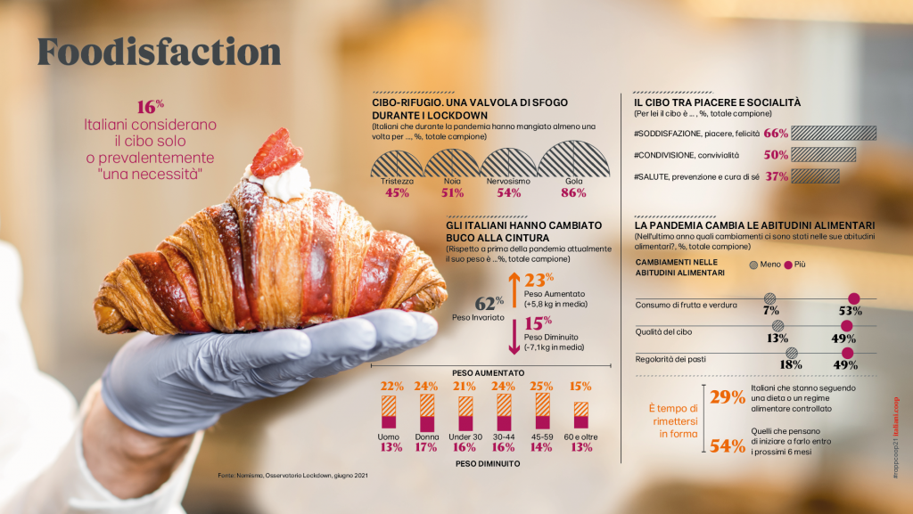 L’ambiente e la salute siedono a tavola – Specchio e metafora dei cambiamenti degli italiani, il cibo esce profondamente trasformato dalla pandemia e si colora di verde. 1 italiano su 2 ha cambiato le proprie consuetudini alimentari, chi indulgendo nel conforto alimentare (sono il 23% coloro che hanno preso peso – in media + 5,8 kg) e chi approfittandone per una dieta più equilibrata e salutare (15% quelli che hanno perso peso in media –7,1 kg). Se solo il 18% non si riconosce in alcuna cultura alimentare e il 24% fa riferimento solo alla dieta mediterranea, oltre la metà degli italiani si riconosce anche o esclusivamente in altre identità alimentari (bio, veg&veg, gourmet, iperproteici e low carbs), ma la vera novità del 2021 è la comparsa della nuova tribù dei climatariani, ovvero di coloro (1 italiano su 6) che dichiarano di adeguare il proprio regime alimentare per ridurre l’impatto ambientale. E comunque l’ambiente diventa riferimento di molti italiani; l’88% associa al cibo il concetto di sostenibilità che significa per il 33% avere un metodo di produzione rispettoso, per un altro 33% attenzione agli imballaggi, per il 21% è sinonimo di origine e filiera e per il 9% di responsabilità etica. Così, il 13% sta riducendo il consumo di carne (i cosiddetti reducetariani), si preferiscono prodotti locali e di stagione, i veg sono consumati anche da chi cerca solo una alternativa proteica alla carne e raddoppiano le vendite di proposte vegane di nuova generazione (le bevande, le besciamelle, i piatti pronti). E non è un caso che gli italiani riconoscano nel riscaldamento climatico il principale fattore di cambiamento del cibo del futuro, sia prevedendone una maggiore scarsità a causa del climate change (26%), sia immaginando che per salvare il clima occorrerà cambiare la nostra alimentazione (32%). Per gli italiani un aiuto verrà dalla scienza e dalla tecnologia (26%) e in questo senso tra le new entry sulle tavole degli italiani da qui a 10 anni ci sono cibi vegetali con il sapore di carne, a base di alghe, farina di insetti e anche la carne coltivata in vitro. In realtà la food revolution è già in corso. Gli investimenti nel solo 2020 in cibi e bevande di prossima generazione ammontano a 6,2 miliardi.